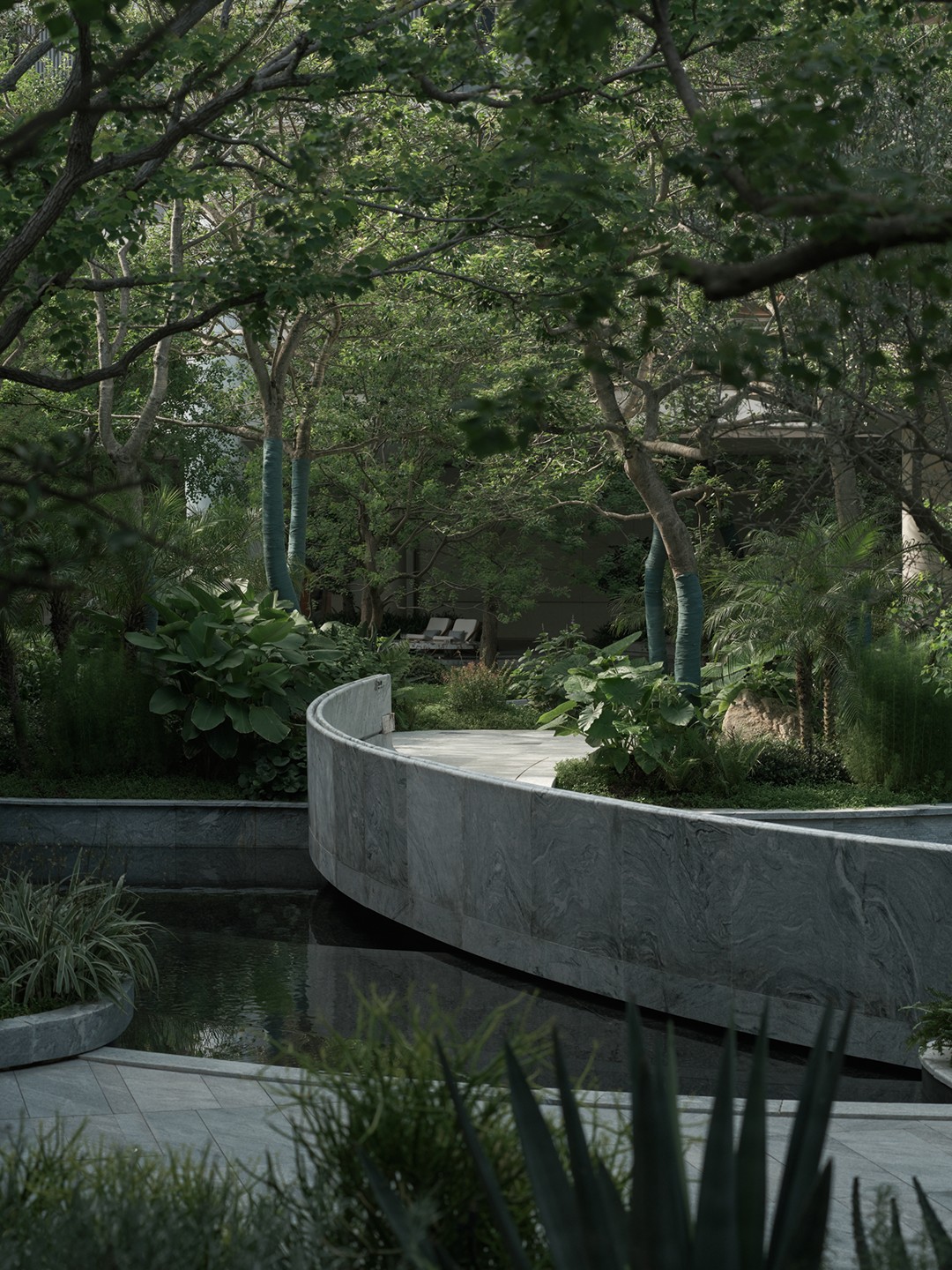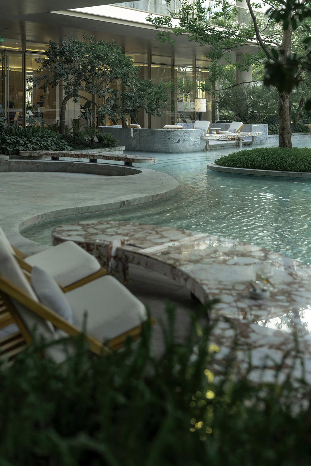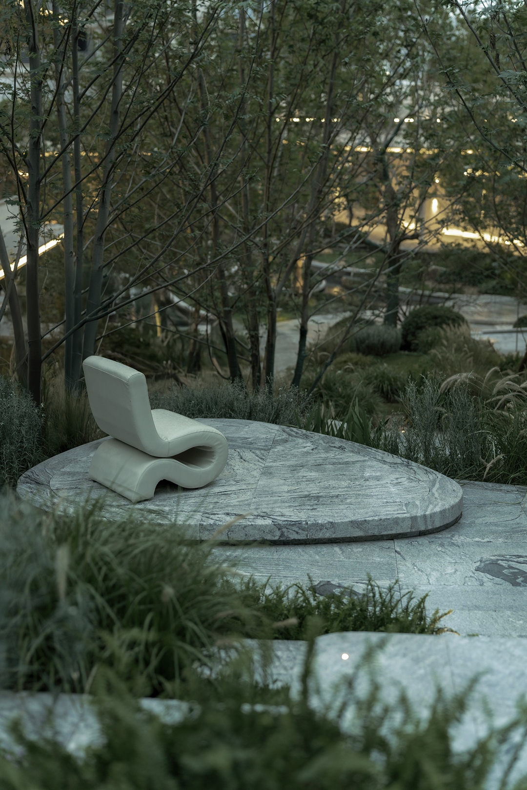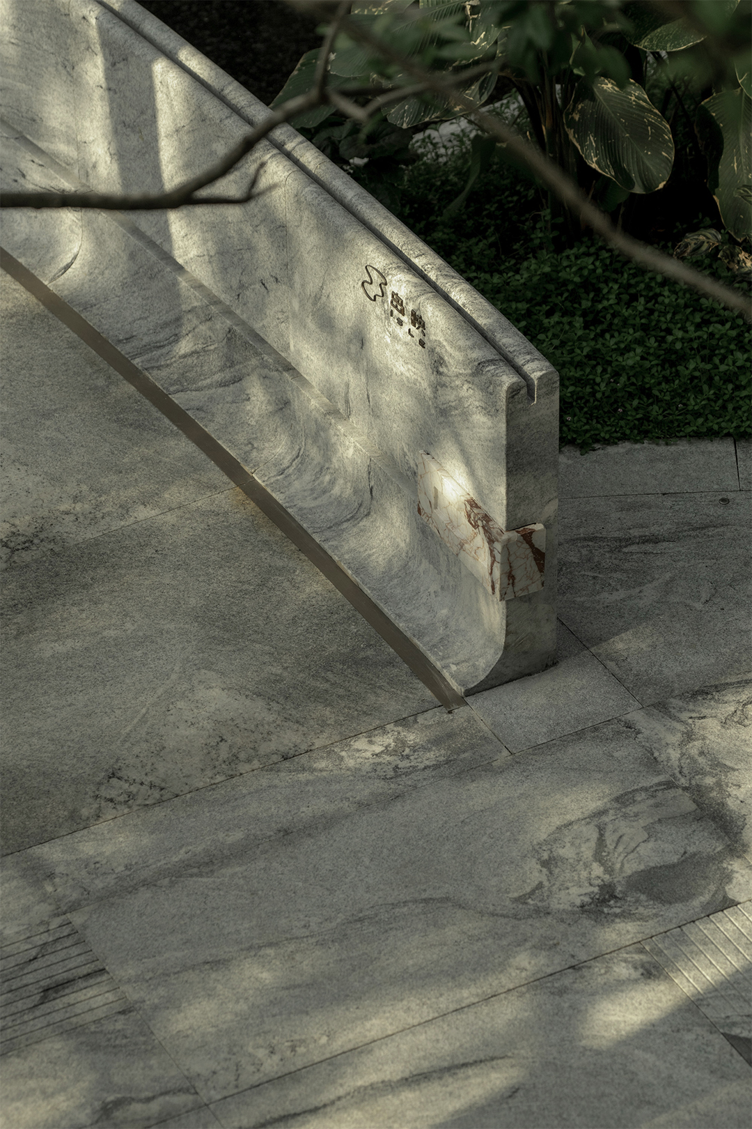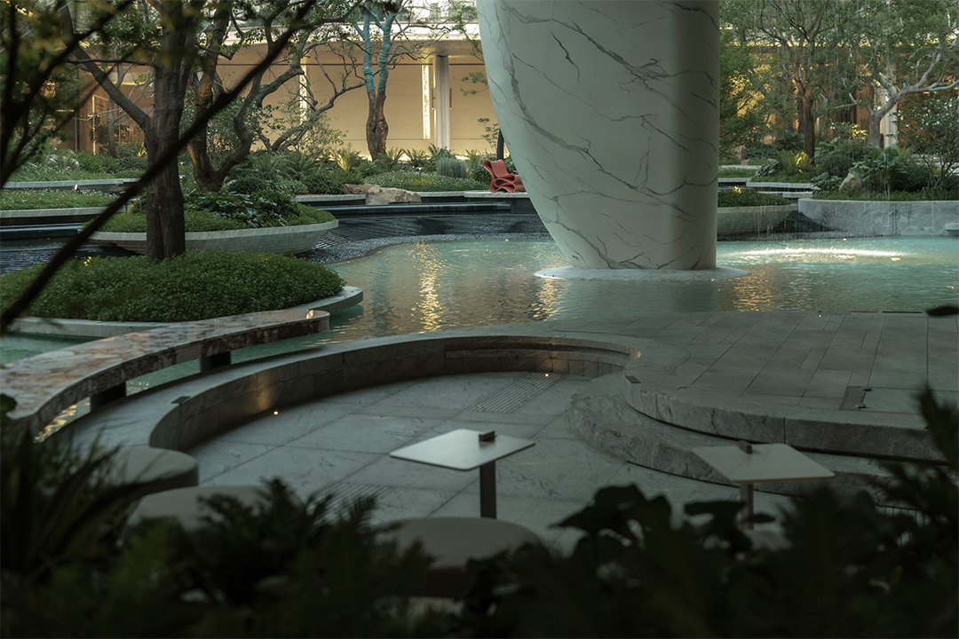 The floating bridge primarily features Viscount White granite, accented with Babeli Red marble, striking a balance between raw nature and refined elegance. It offers a healing experience of walking into the wilderness, while every view reveals a touch of subtle sophistication.