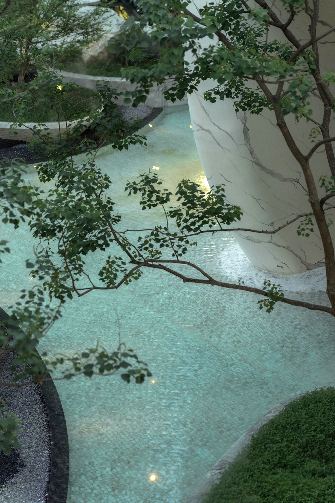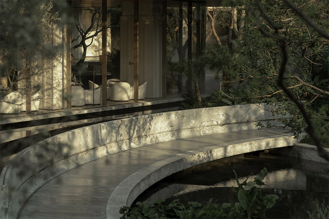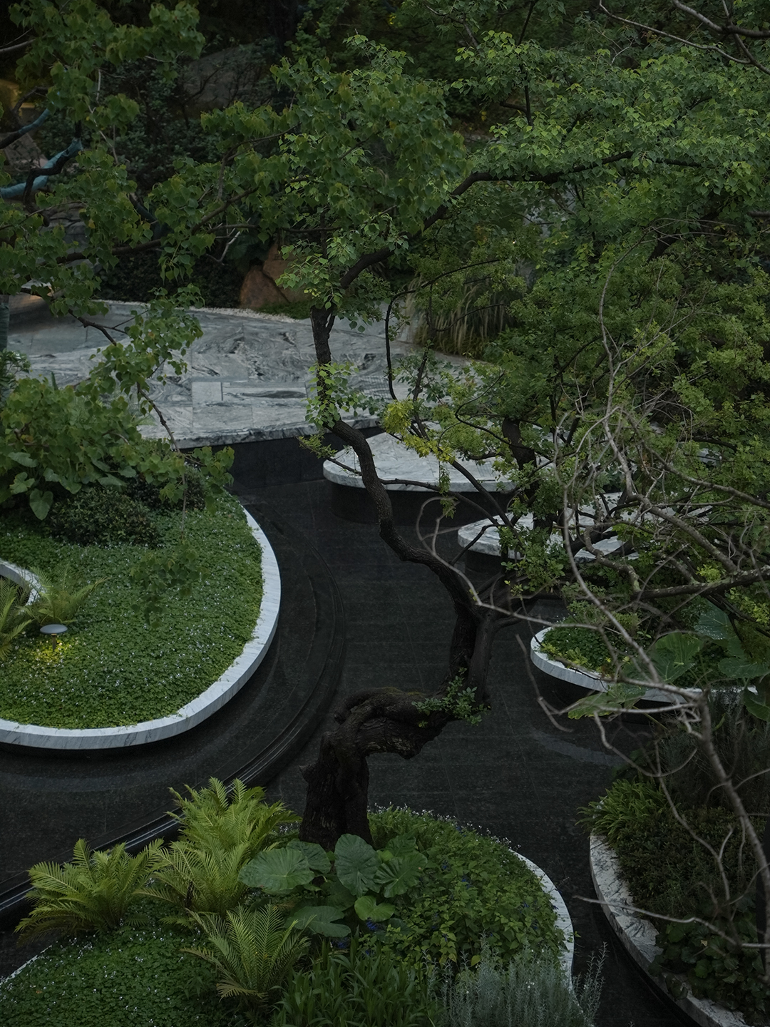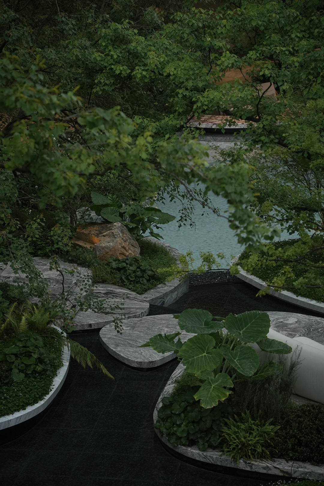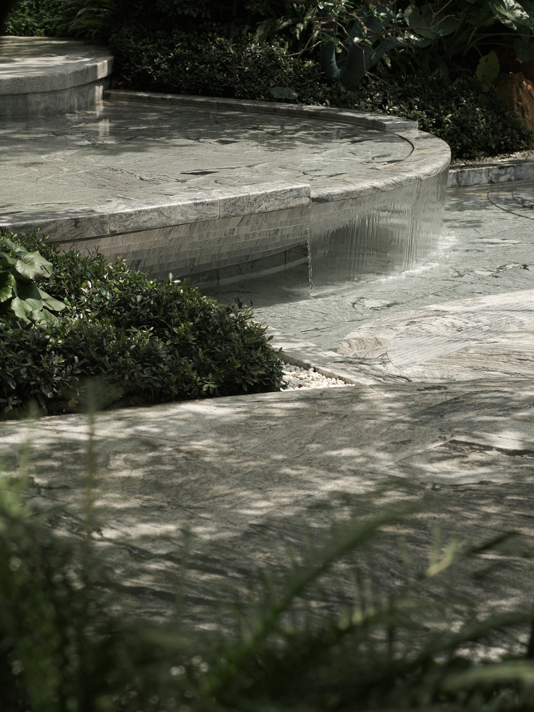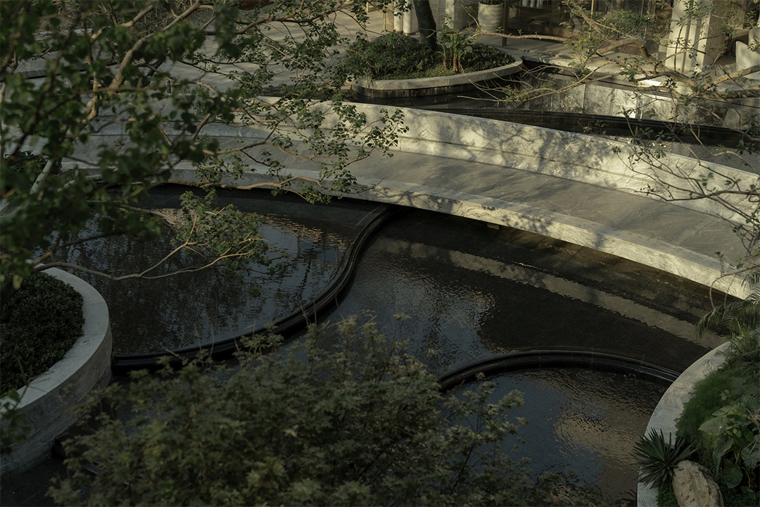 The floating bridge primarily features Viscount White granite, accented with Babeli Red marble, striking a balance between raw nature and refined elegance. It offers a healing experience of walking into the wilderness, while every view reveals a touch of subtle sophistication.