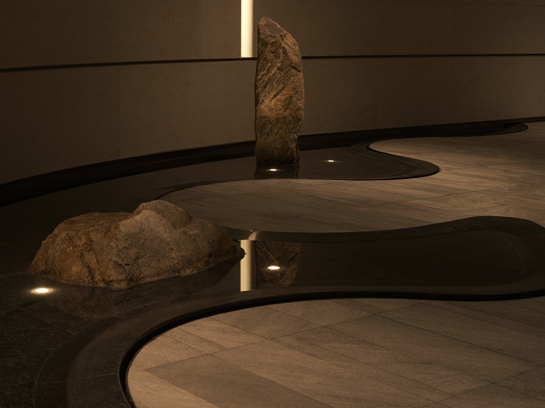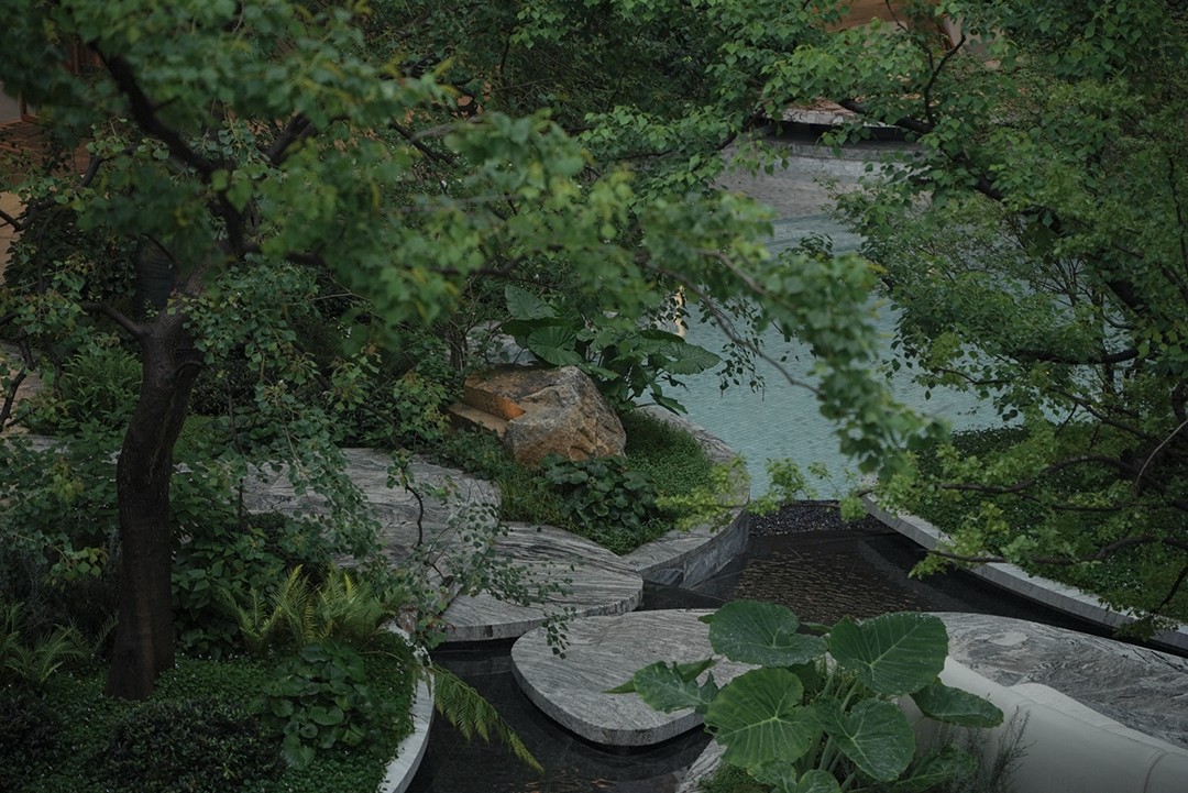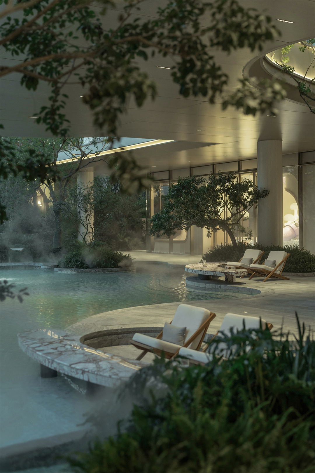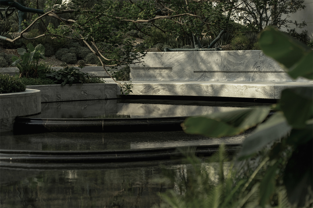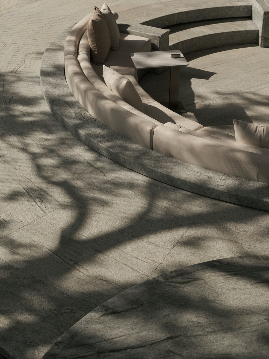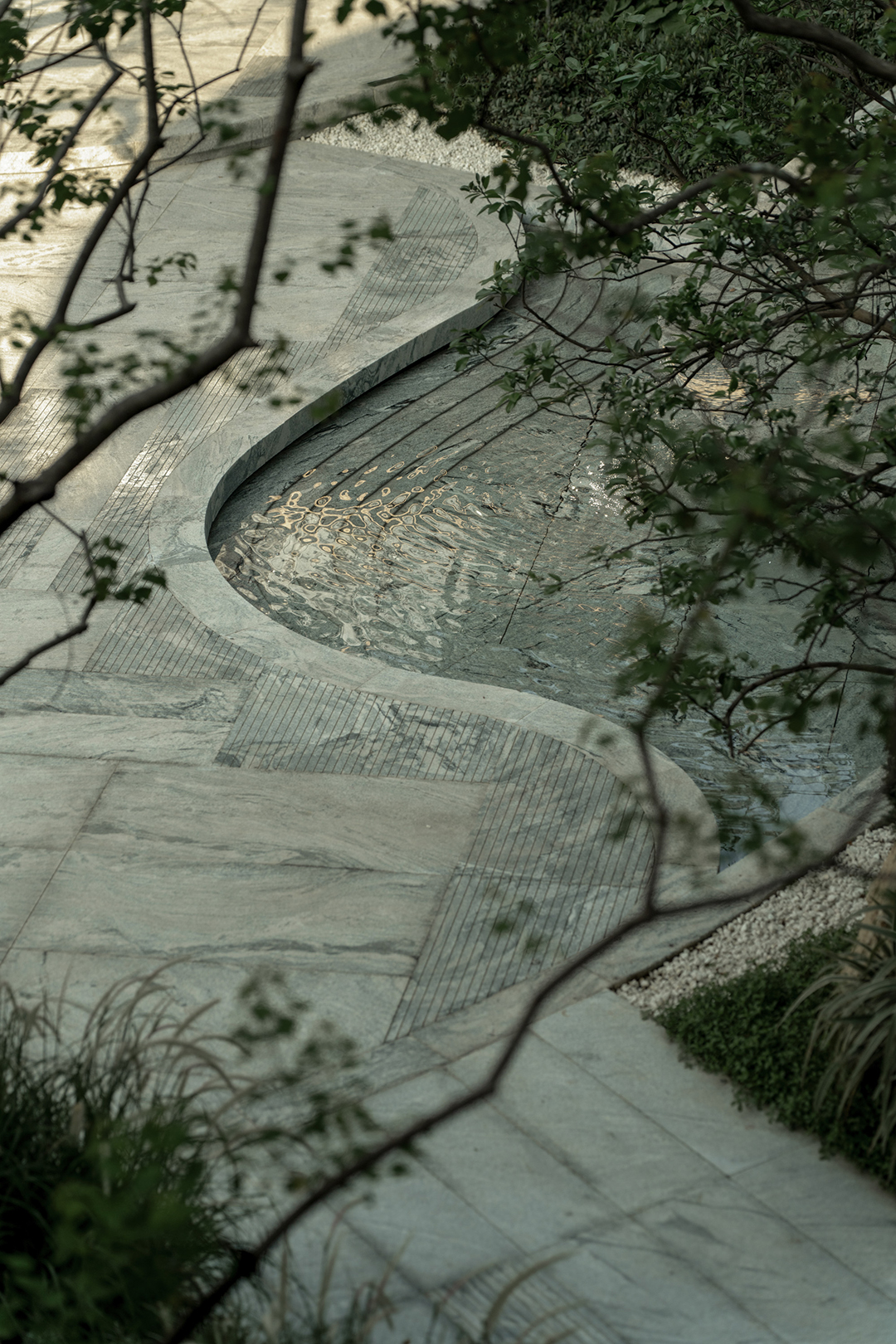 The floating bridge primarily features Viscount White granite, accented with Babeli Red marble, striking a balance between raw nature and refined elegance. It offers a healing experience of walking into the wilderness, while every view reveals a touch of subtle sophistication.