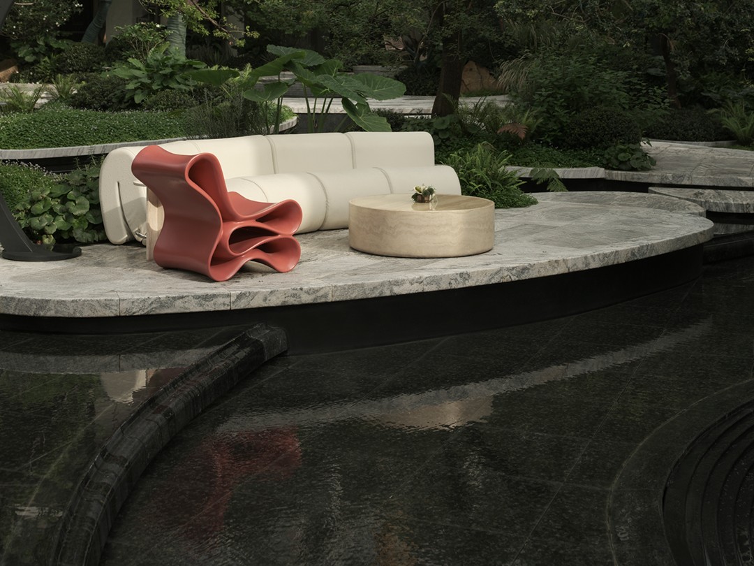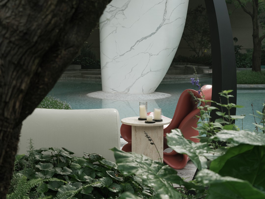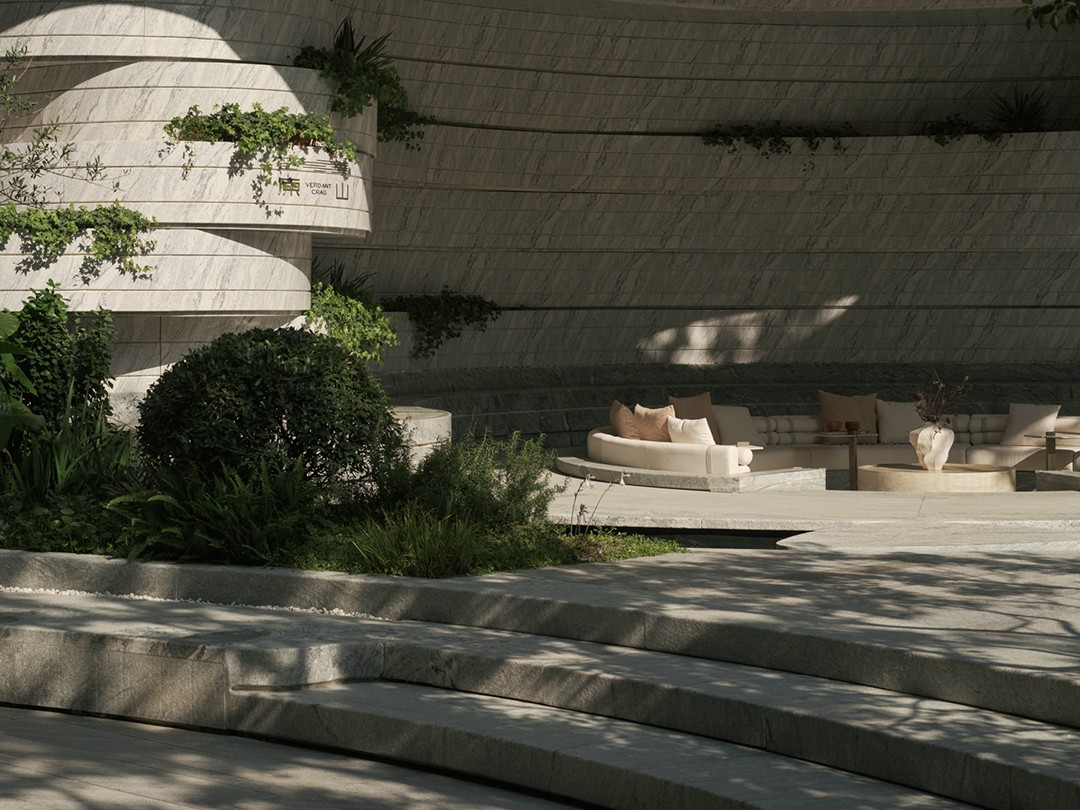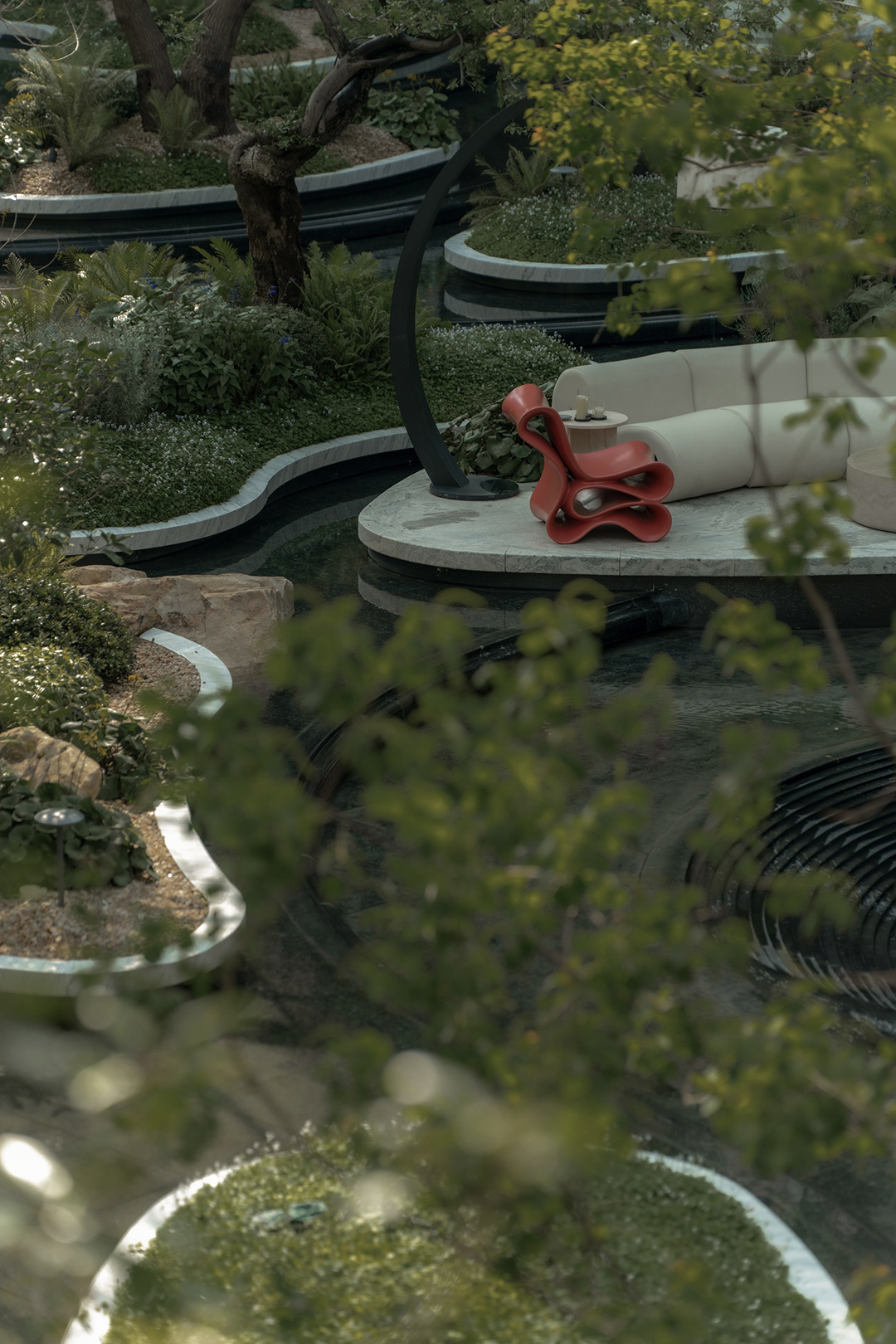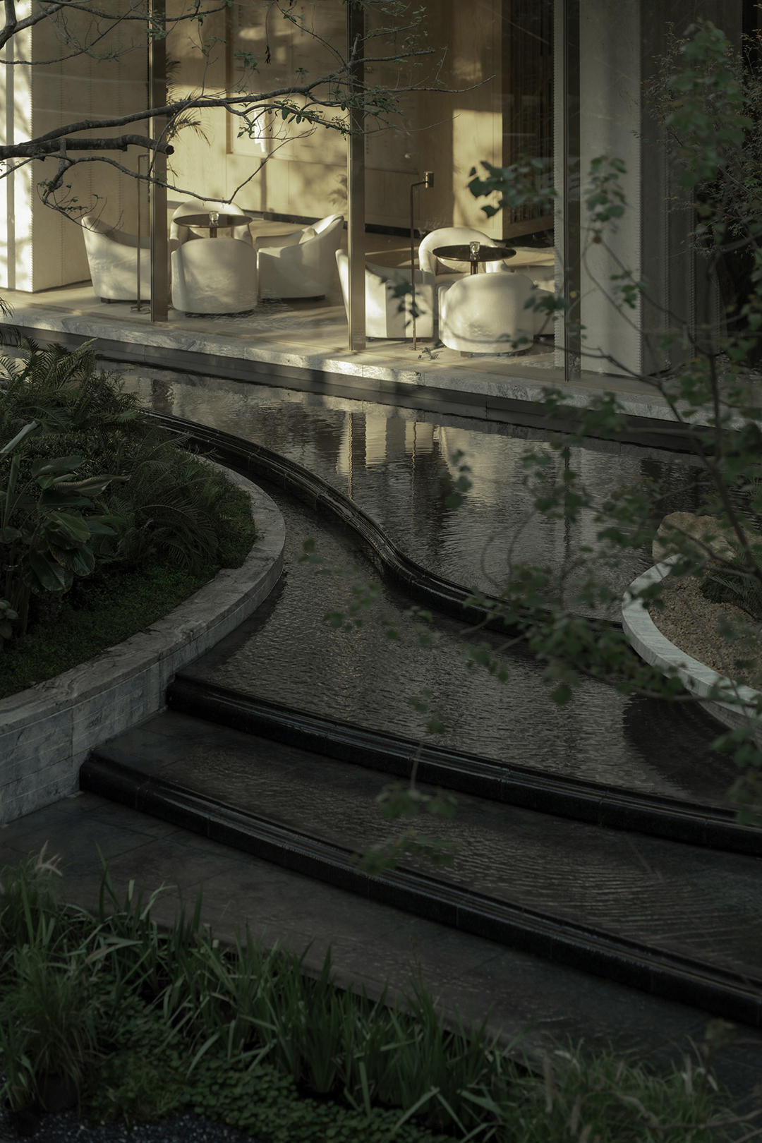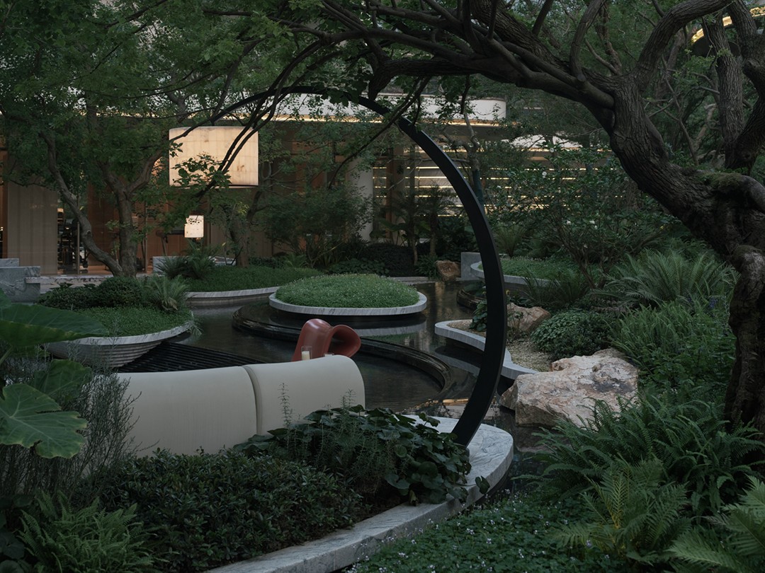 The floating bridge primarily features Viscount White granite, accented with Babeli Red marble, striking a balance between raw nature and refined elegance. It offers a healing experience of walking into the wilderness, while every view reveals a touch of subtle sophistication.