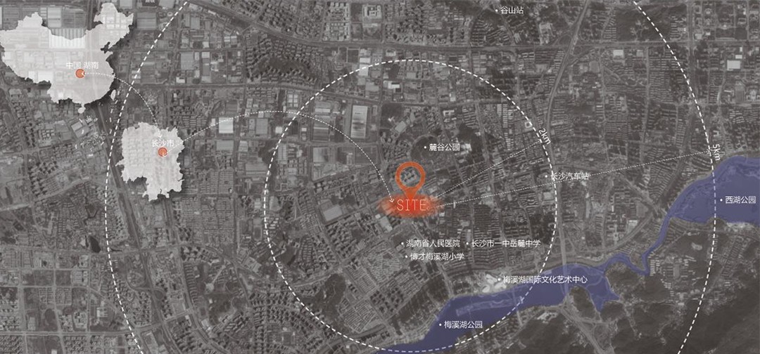The site is located in Yuelu District, Changsha City, Hunan Province, with convenient regional transportation. It is adjacent to Lugu Park in the north and Meixi Lake Park in the south, with a high-quality ecological environment. It is an urban area where technological innovation and youth vitality meet, and the surrounding area is a typical area where universities, science and technology parks, urban residential areas and ecological resources are intertwined.
