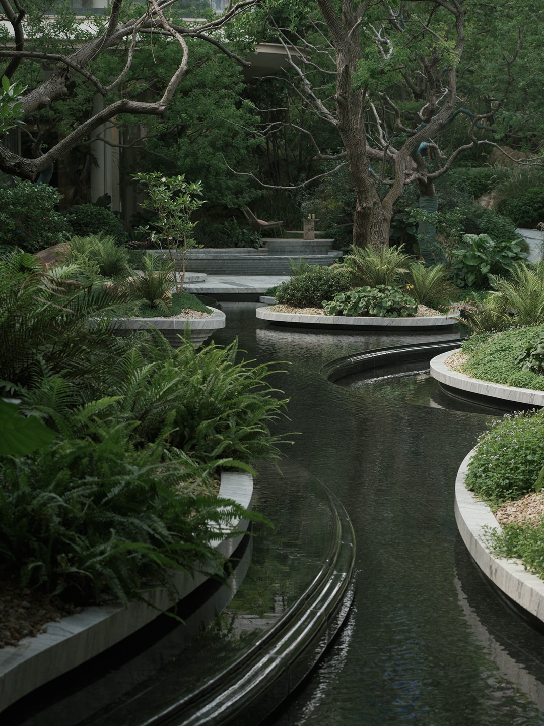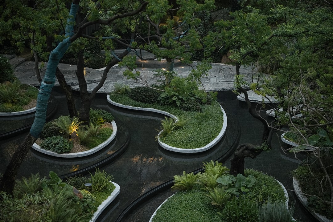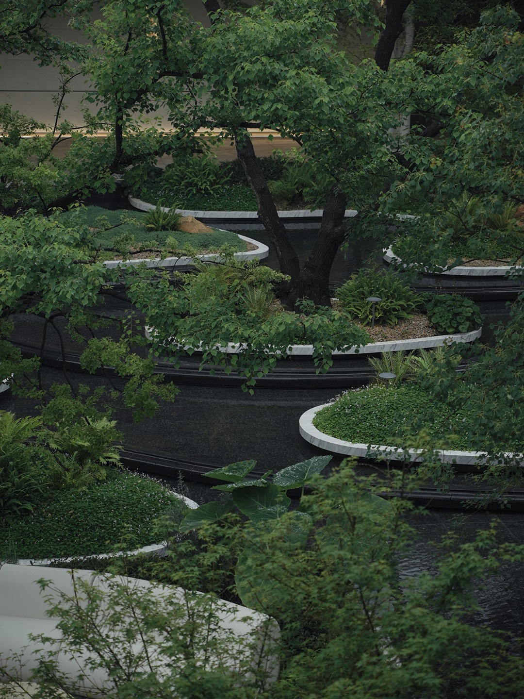 静谧的林涧之间,水面之上,漂浮绿岛自然又富有艺术感,浮岛溪流层层叠叠交错,乌桕与弯杆铁冬青林立在绿色浮岛之上,营造出静谧雅致的空间氛围。