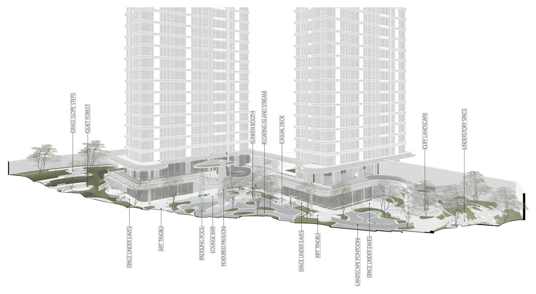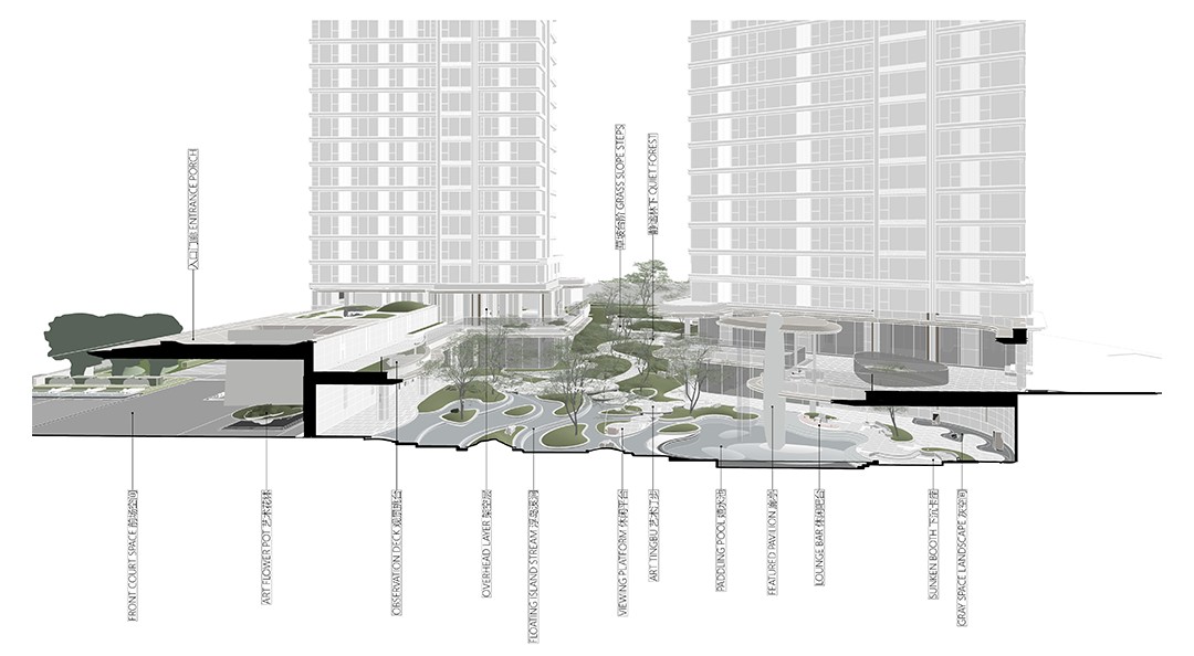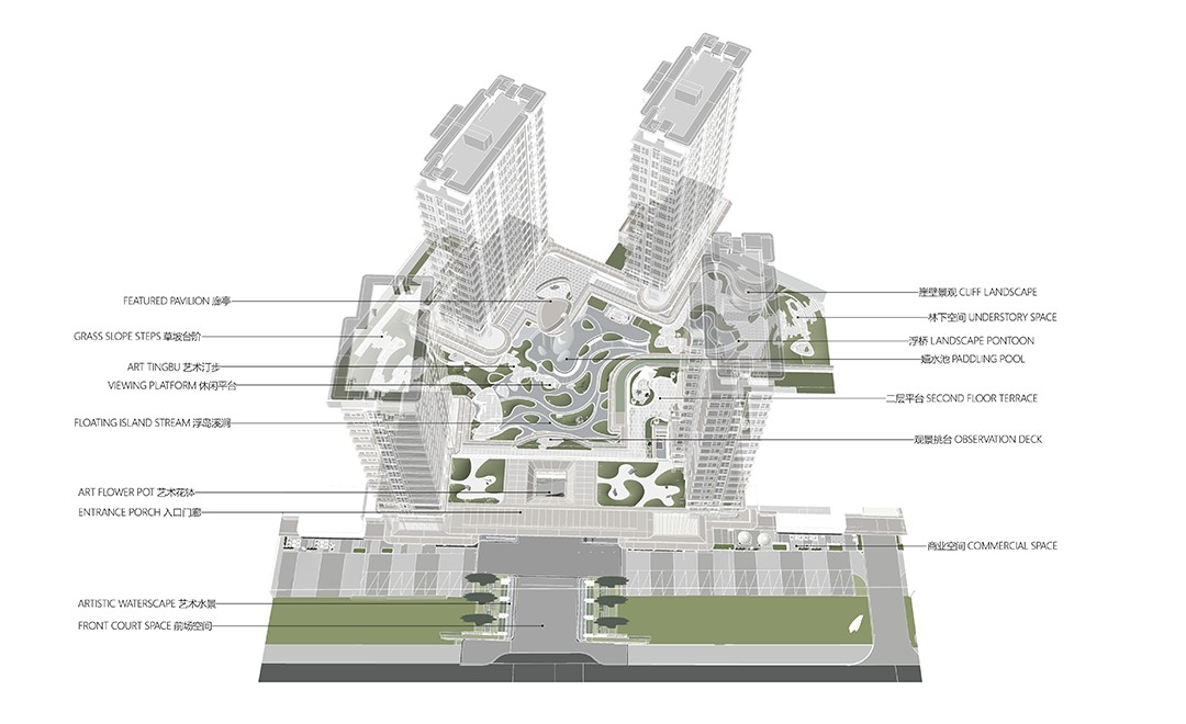 The entire space mainly emphasizes the relationship between people, and the site landscape provides a space for residents to socialize and entertain.