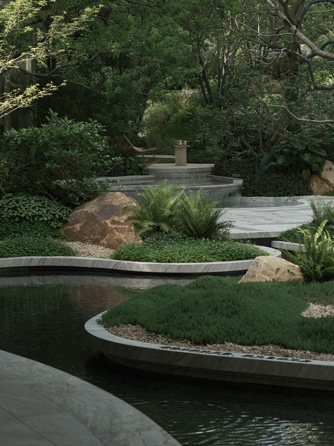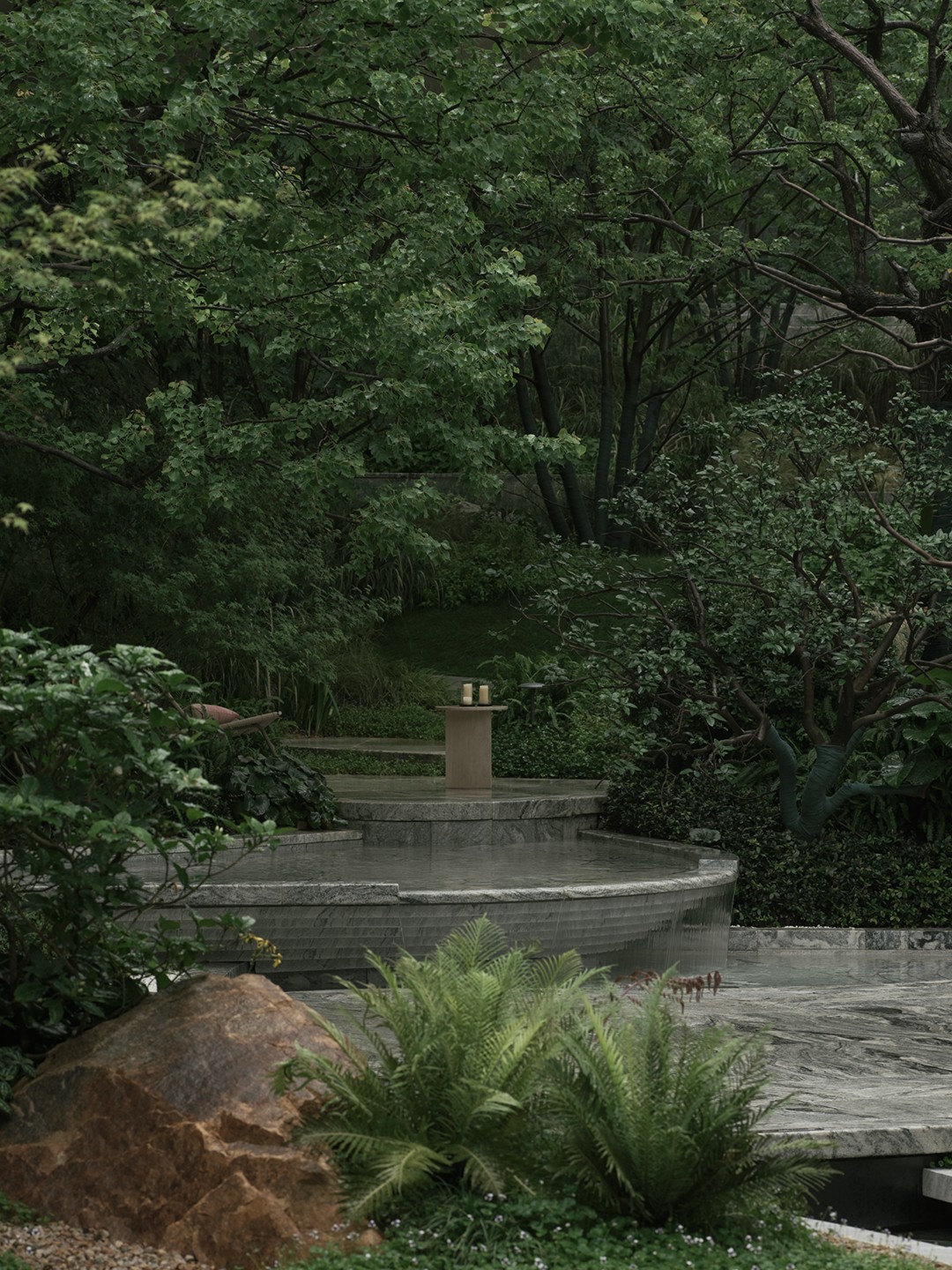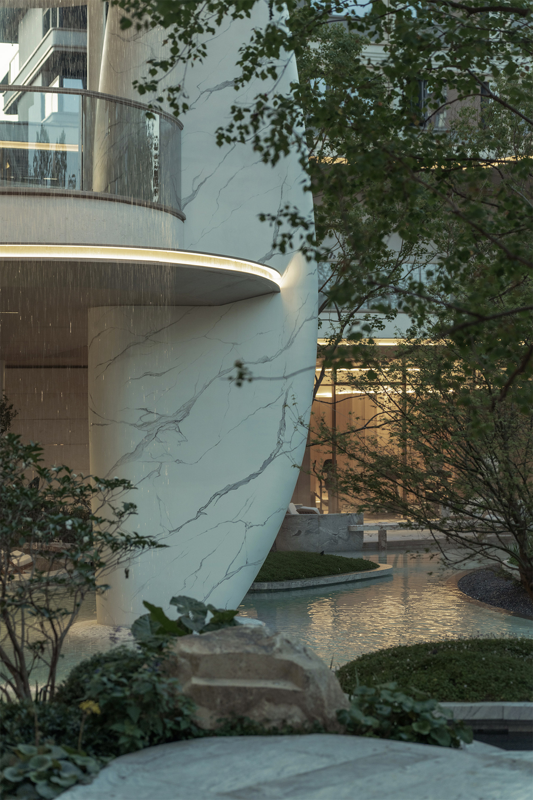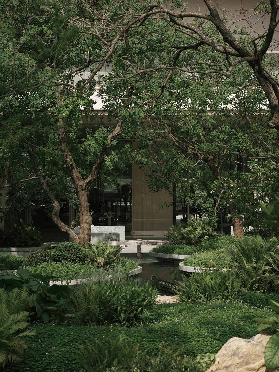 转角处皆是生活的温度,静置的景石仿佛在喃喃低语着场地的故事,在光影与空间中,描摹出理想生活的轮廓。