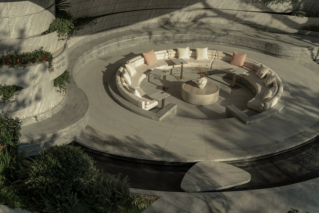 The sunken booths in the cliff space are skillfully embedded into the terrain in an enclosed layout, creating an intimate and pleasant place to socialize and gather.