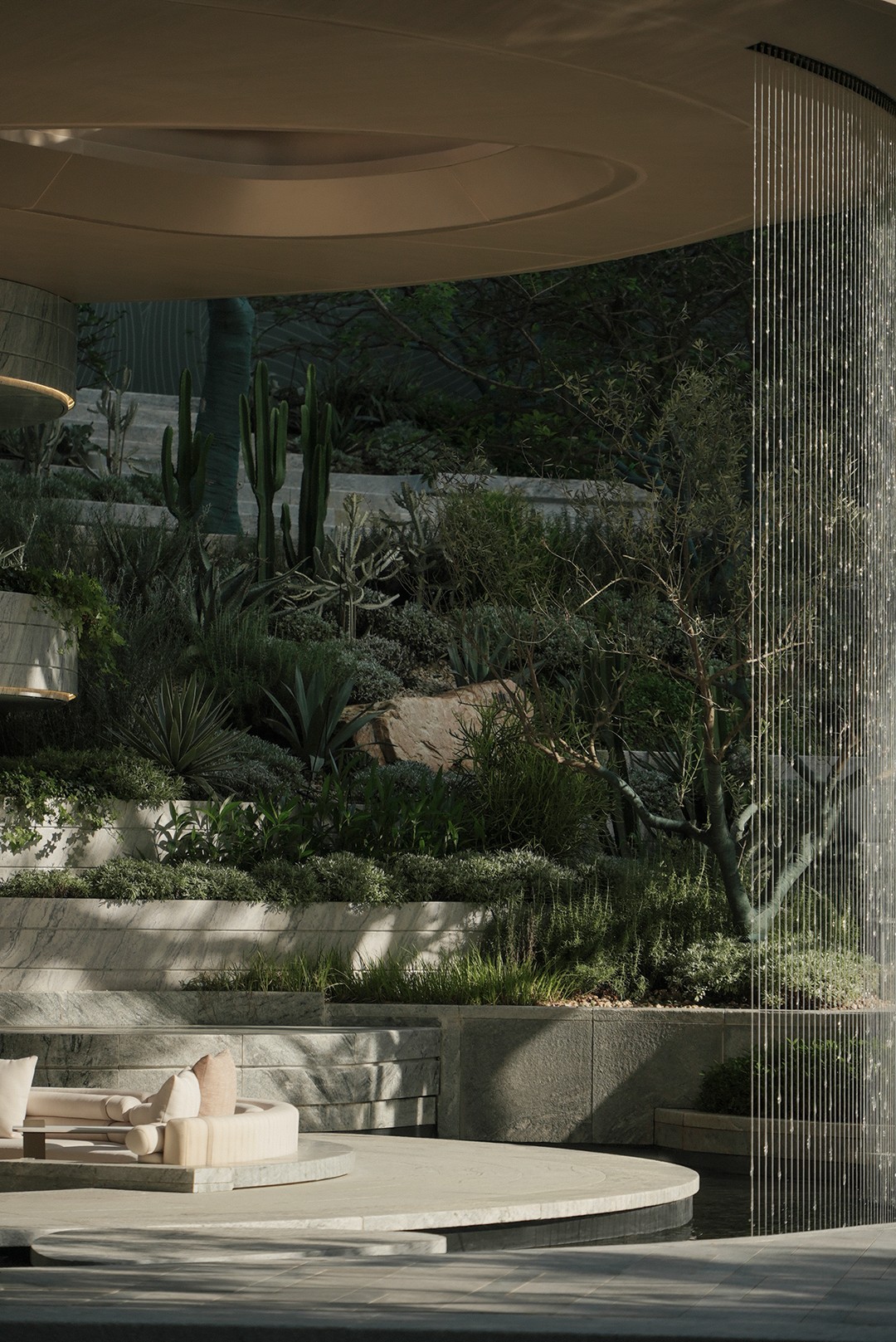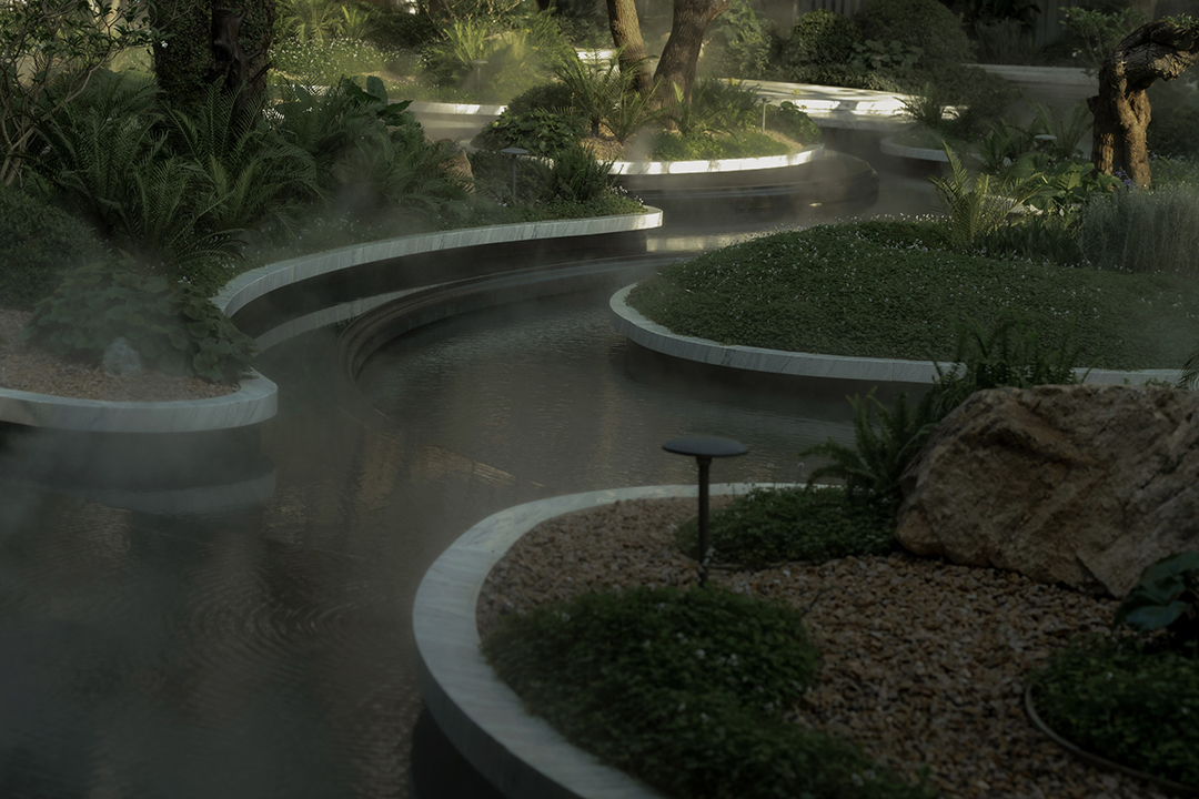 崖壁跌水,浮桥溪涧,使人可以穿梭其间,与自然亲密相拥。拉近了人与自然的距离。也预告了一种拾阶而上的度假级归家体验。