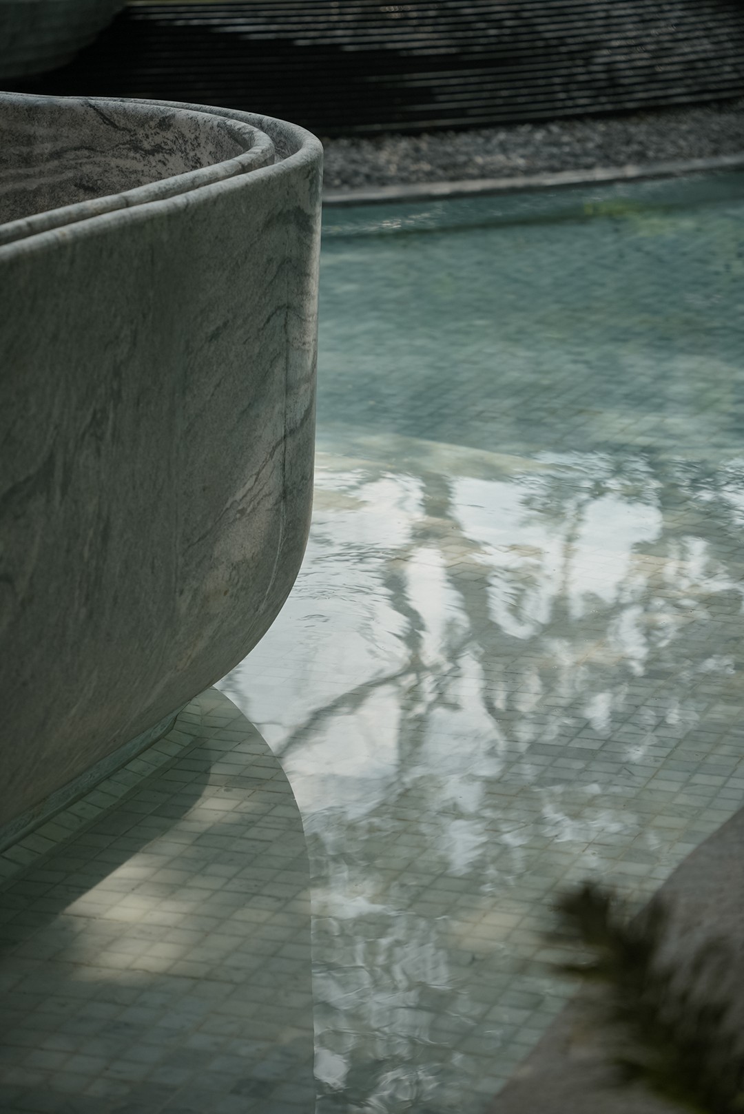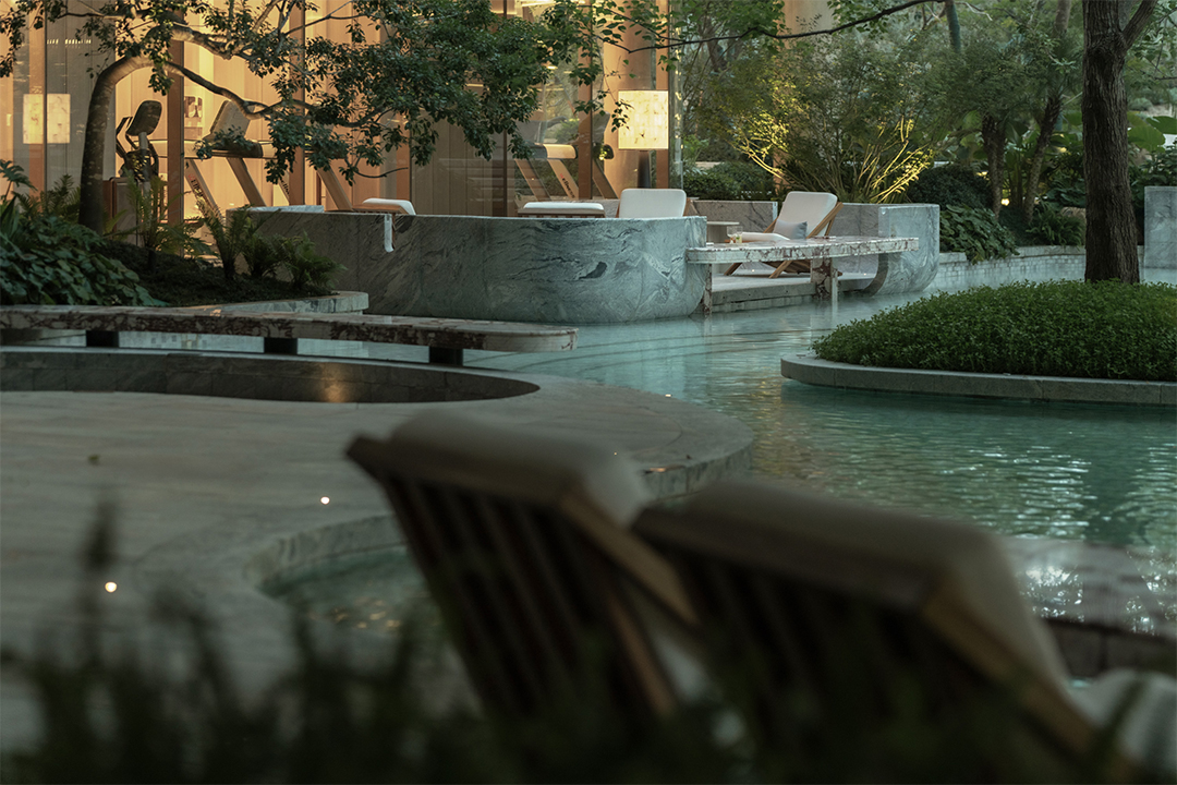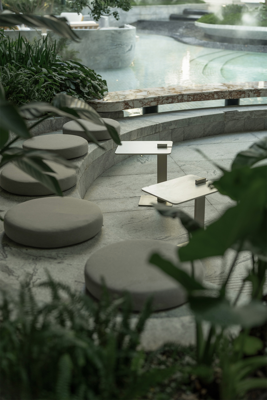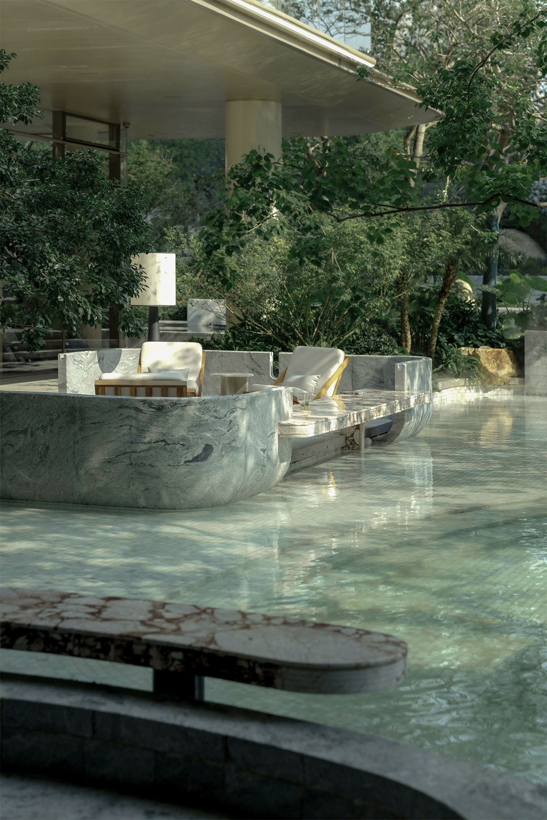 浮桥主要采用的是维斯康白石材,巴宝莉红大理石作为点缀,在精致和原生之间找到一个平衡,不仅给人创造了走进山野的疗愈体验,目光所及之处又是精致与细腻。