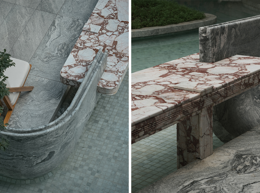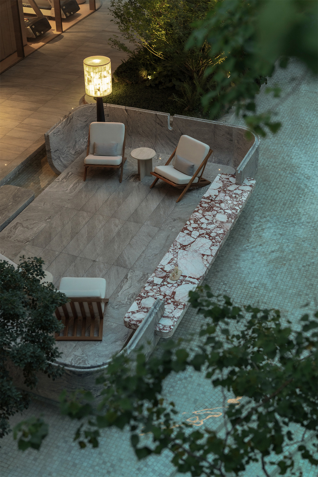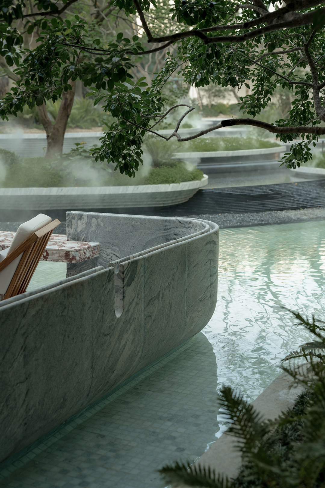 浮桥主要采用的是维斯康白石材,巴宝莉红大理石作为点缀,在精致和原生之间找到一个平衡,不仅给人创造了走进山野的疗愈体验,目光所及之处又是精致与细腻。