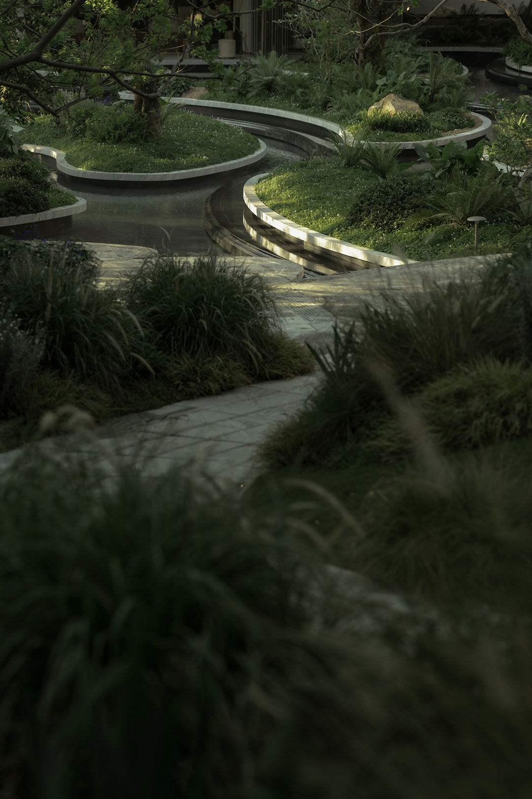 沿着蜿蜒的归家通道分布有景观跌水和休闲平台,在归家的路途中偶尔也可停下脚步感受生活。