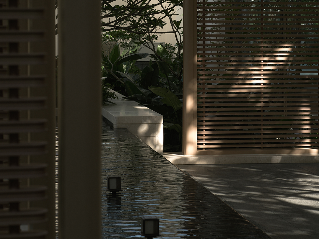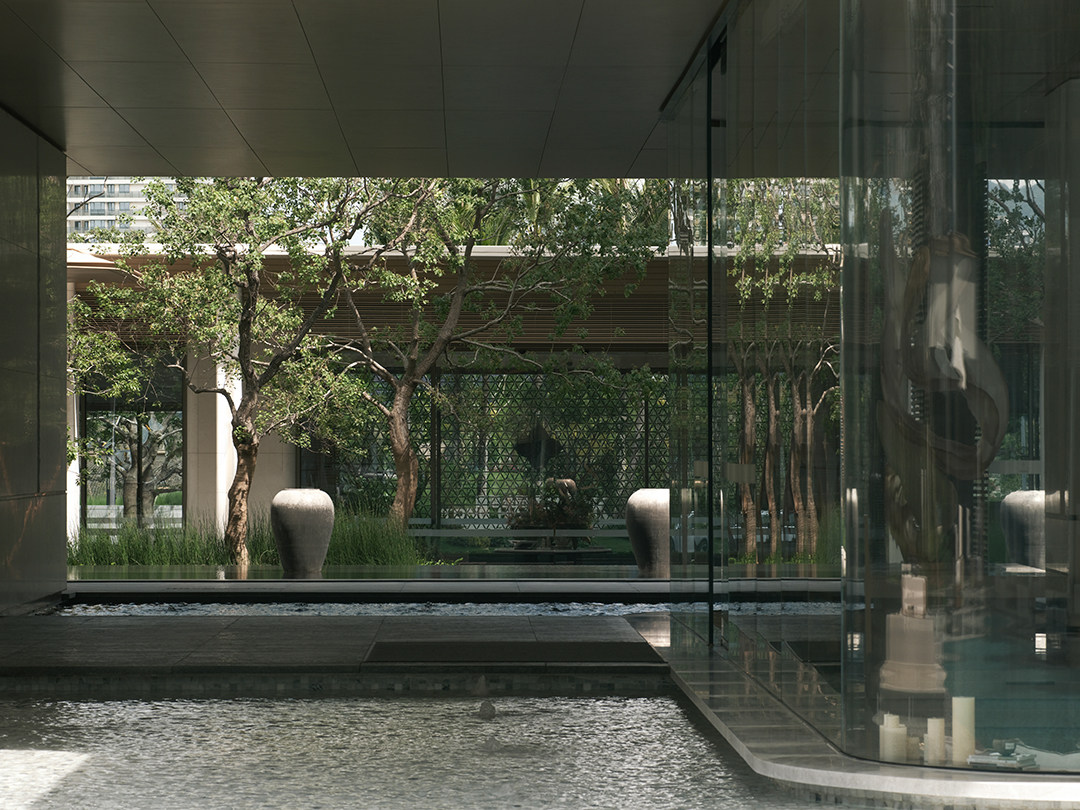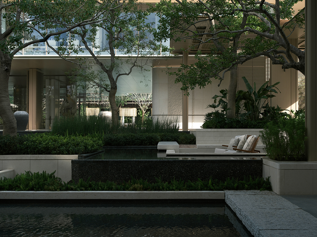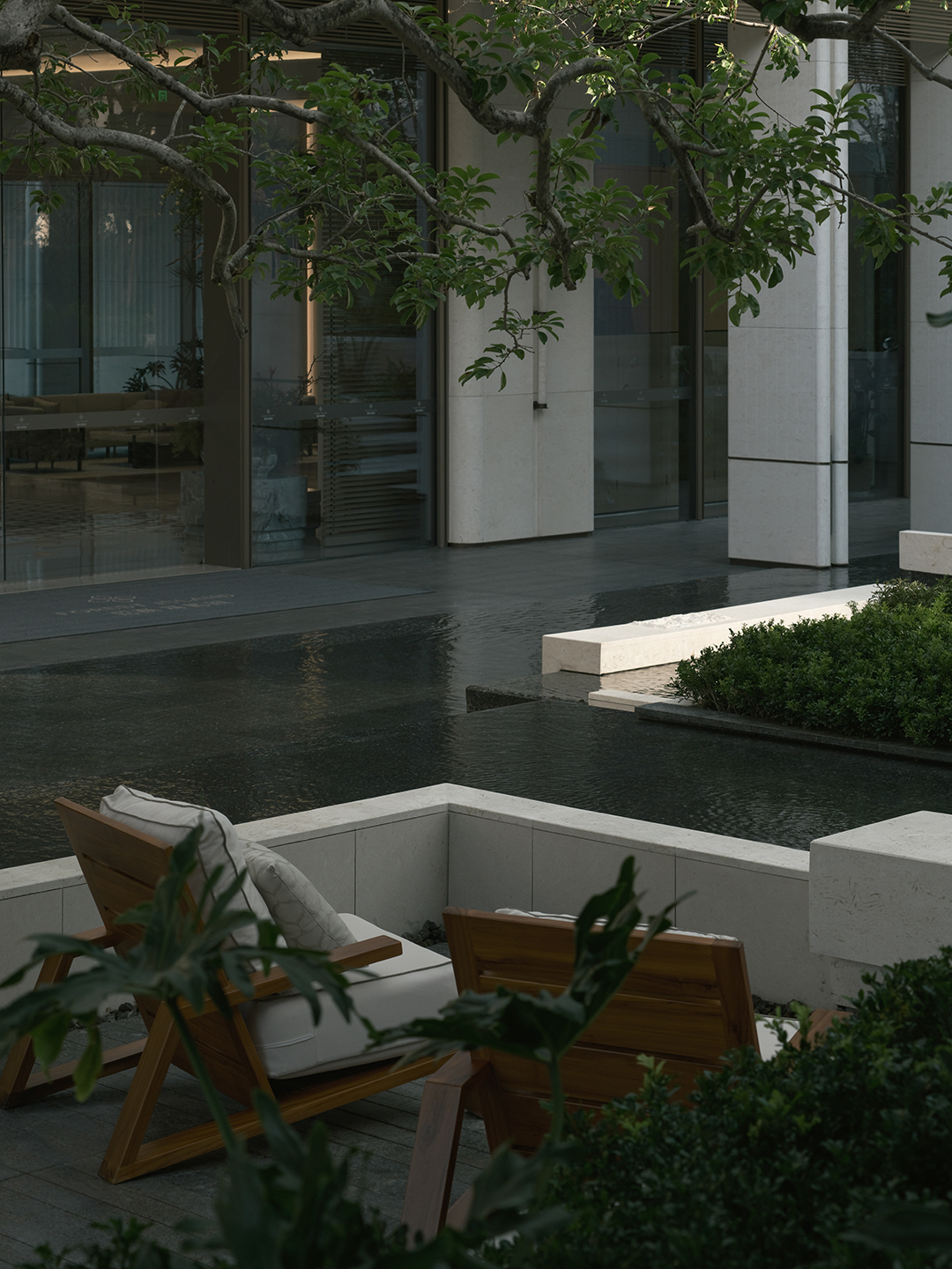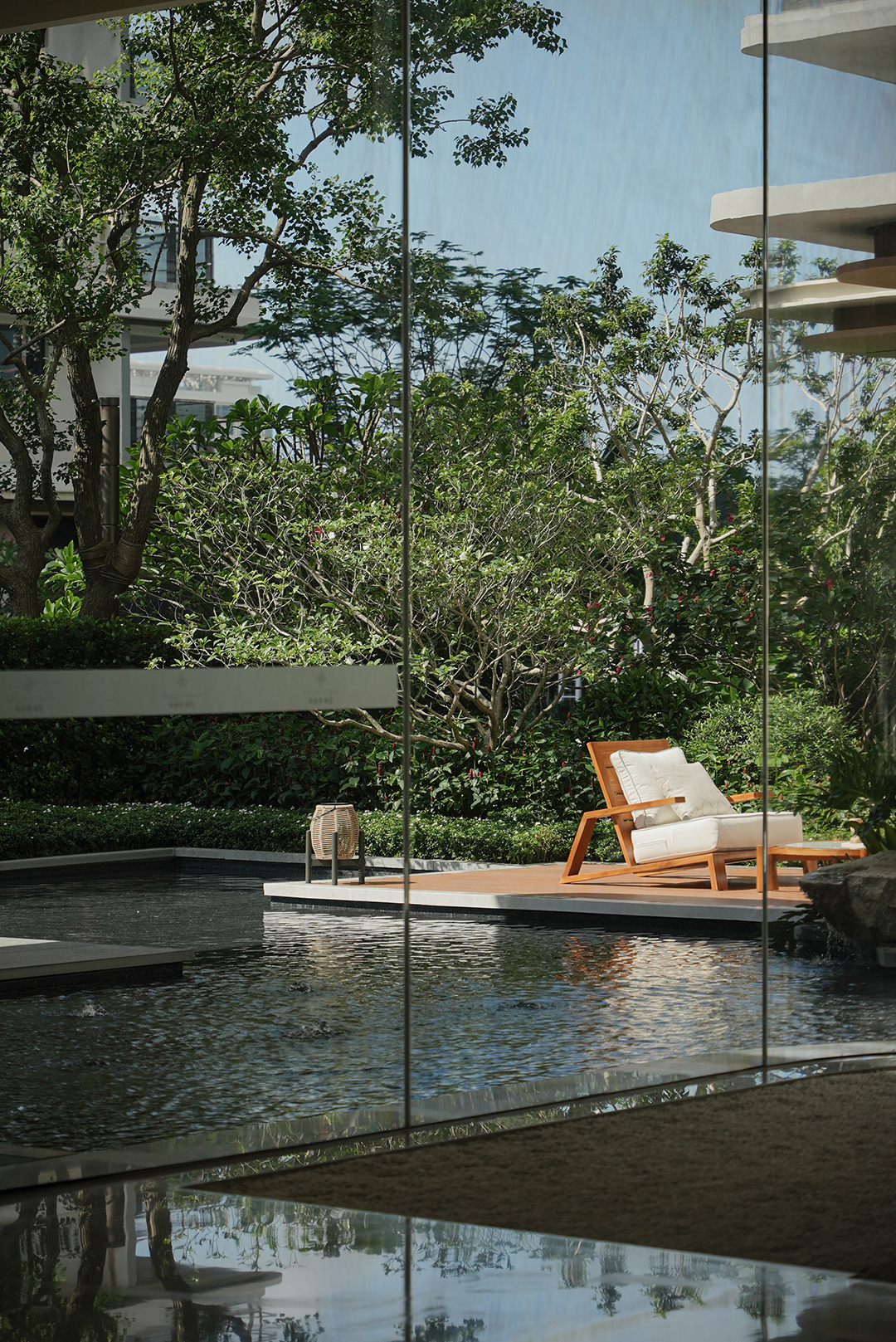 中庭水院以“高差”为基调,静水面、叠水墙、水面倒影与热带植物,以不同的自然意向抚平心绪。