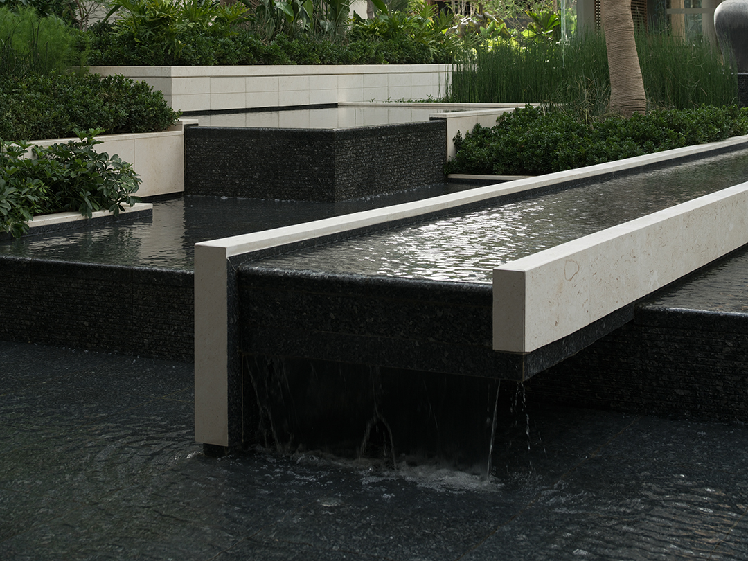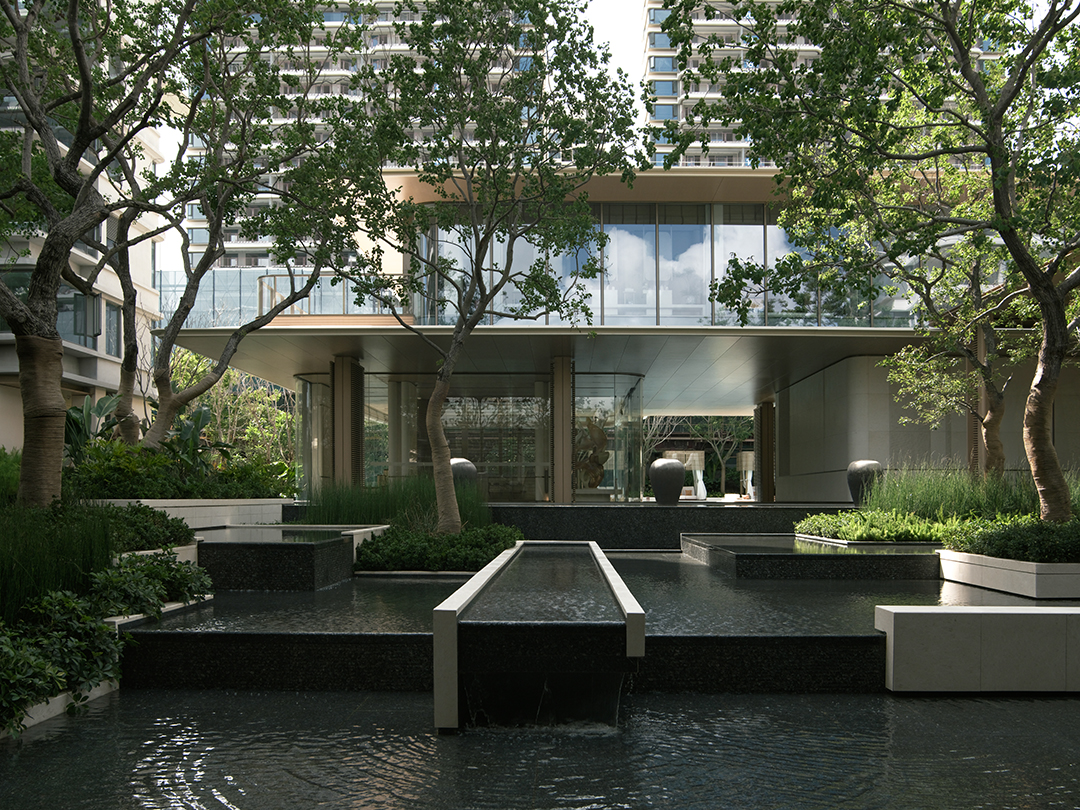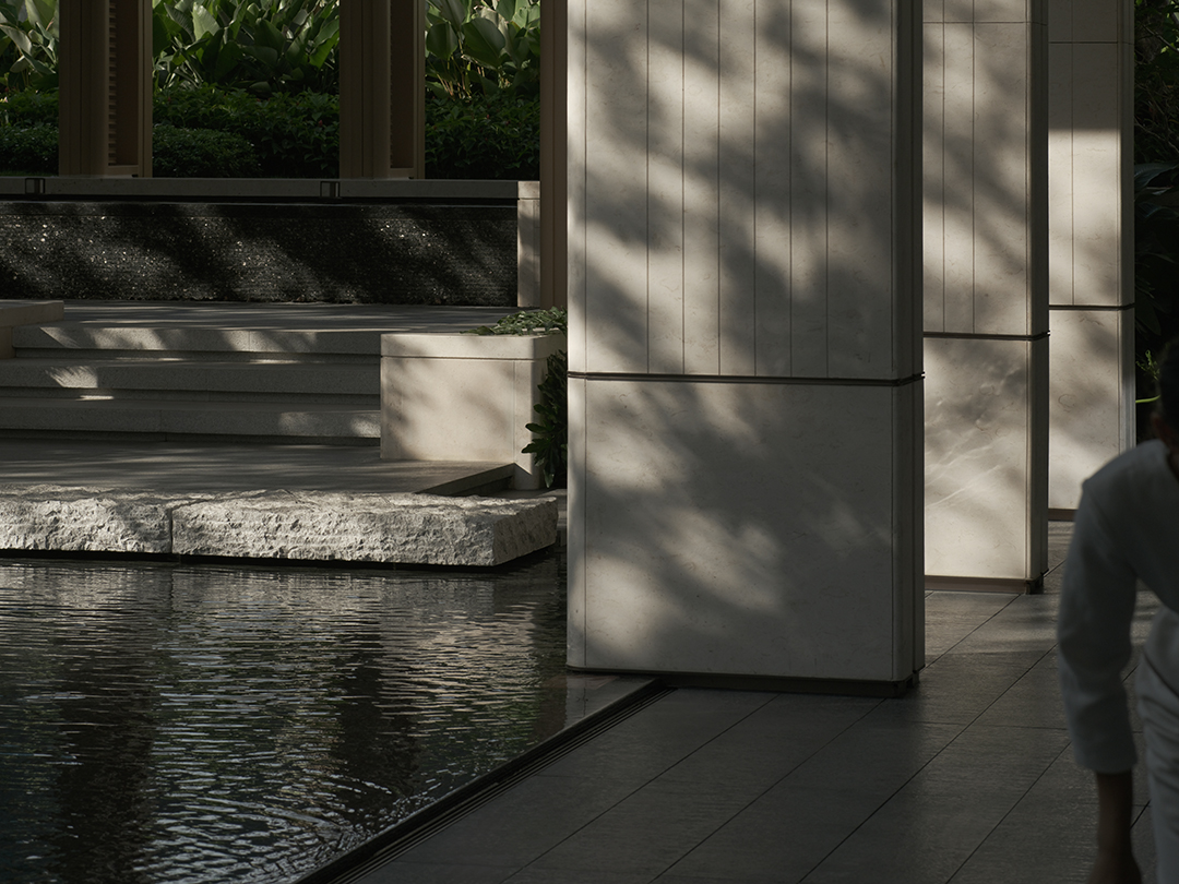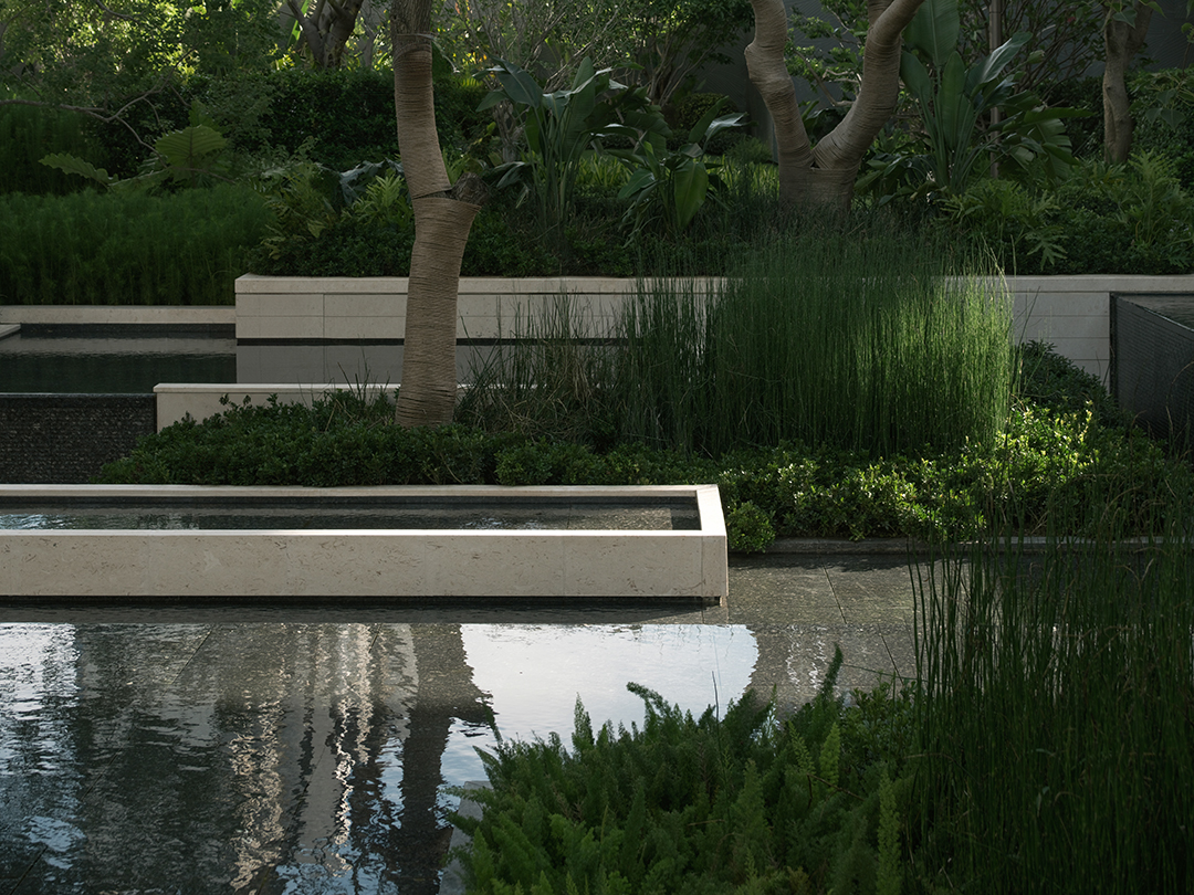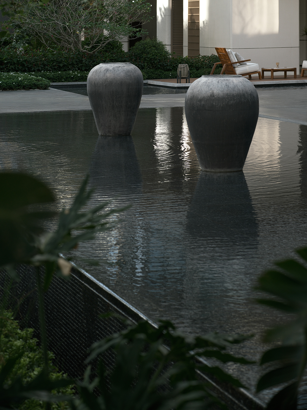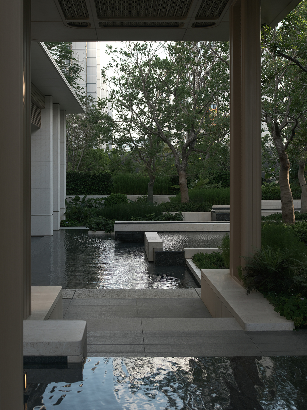 中庭水院以“高差”为基调,静水面、叠水墙、水面倒影与热带植物,以不同的自然意向抚平心绪。