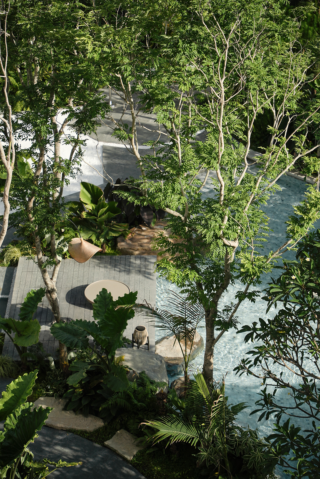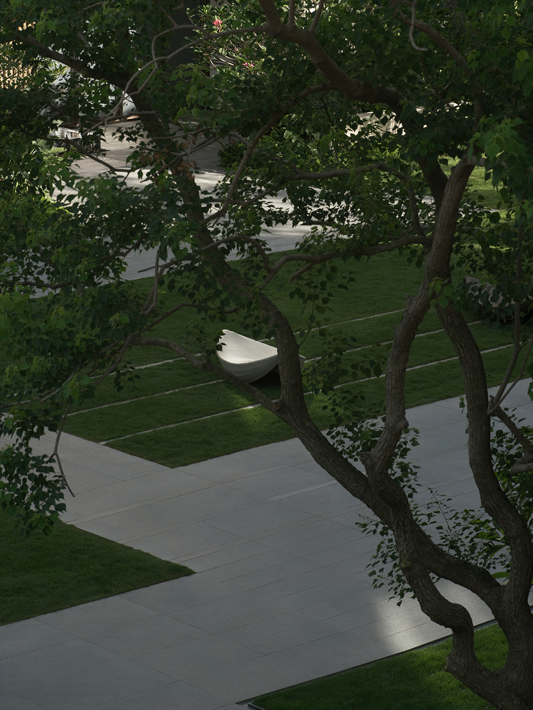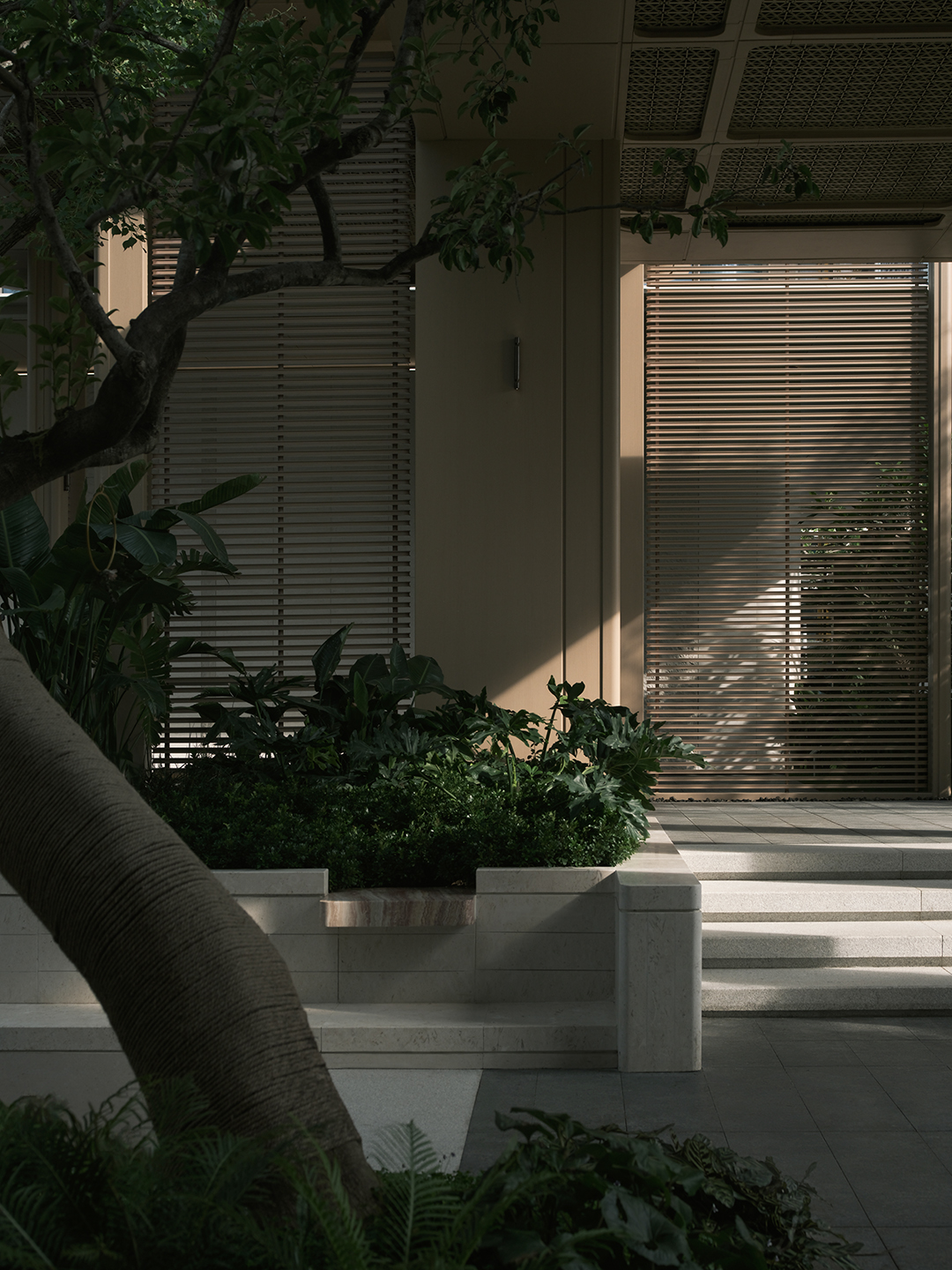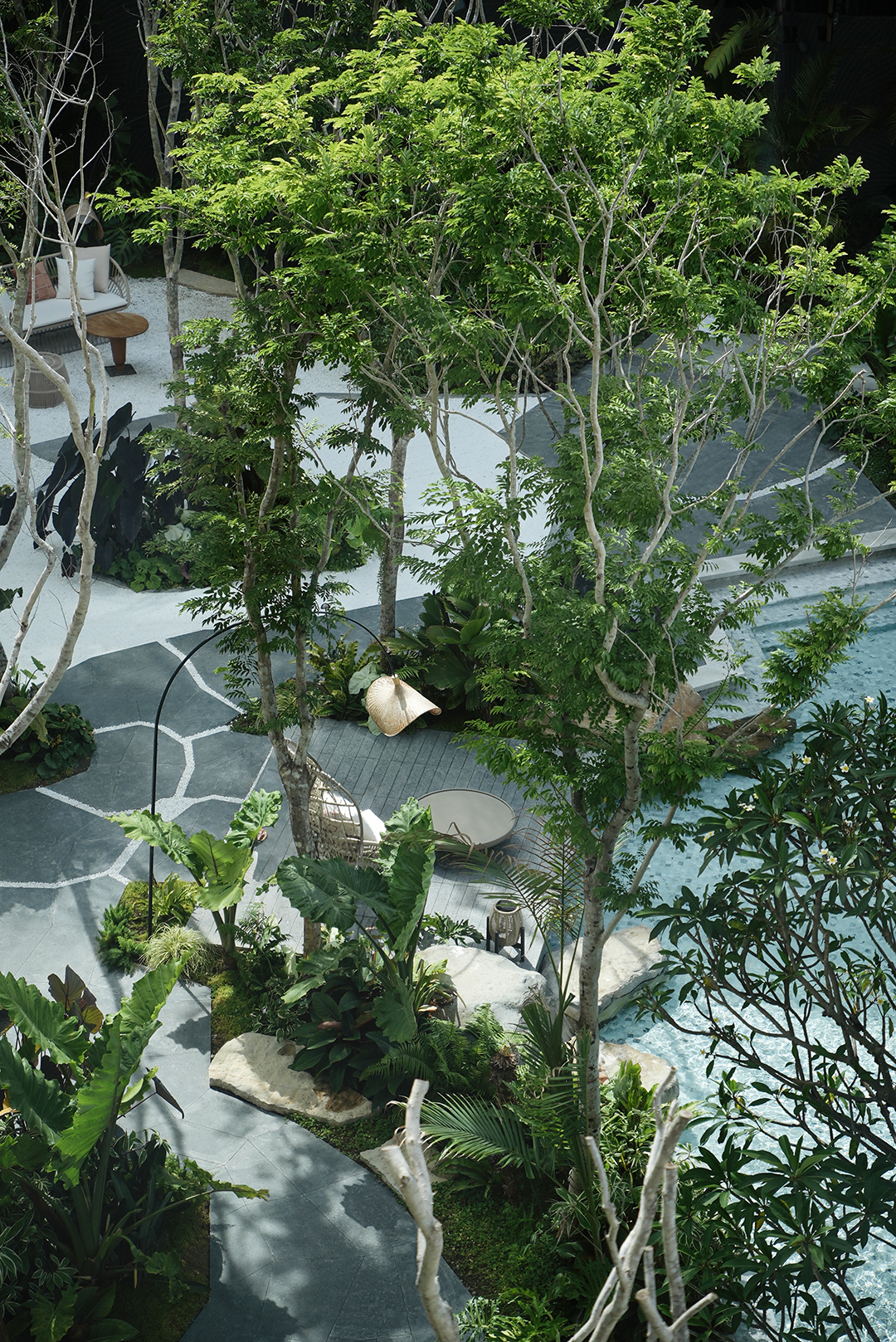 我们利用热带乔木、石材大板铺地与亲人尺度的座椅布局,营造既安静私密、又适合交流的社群场域。