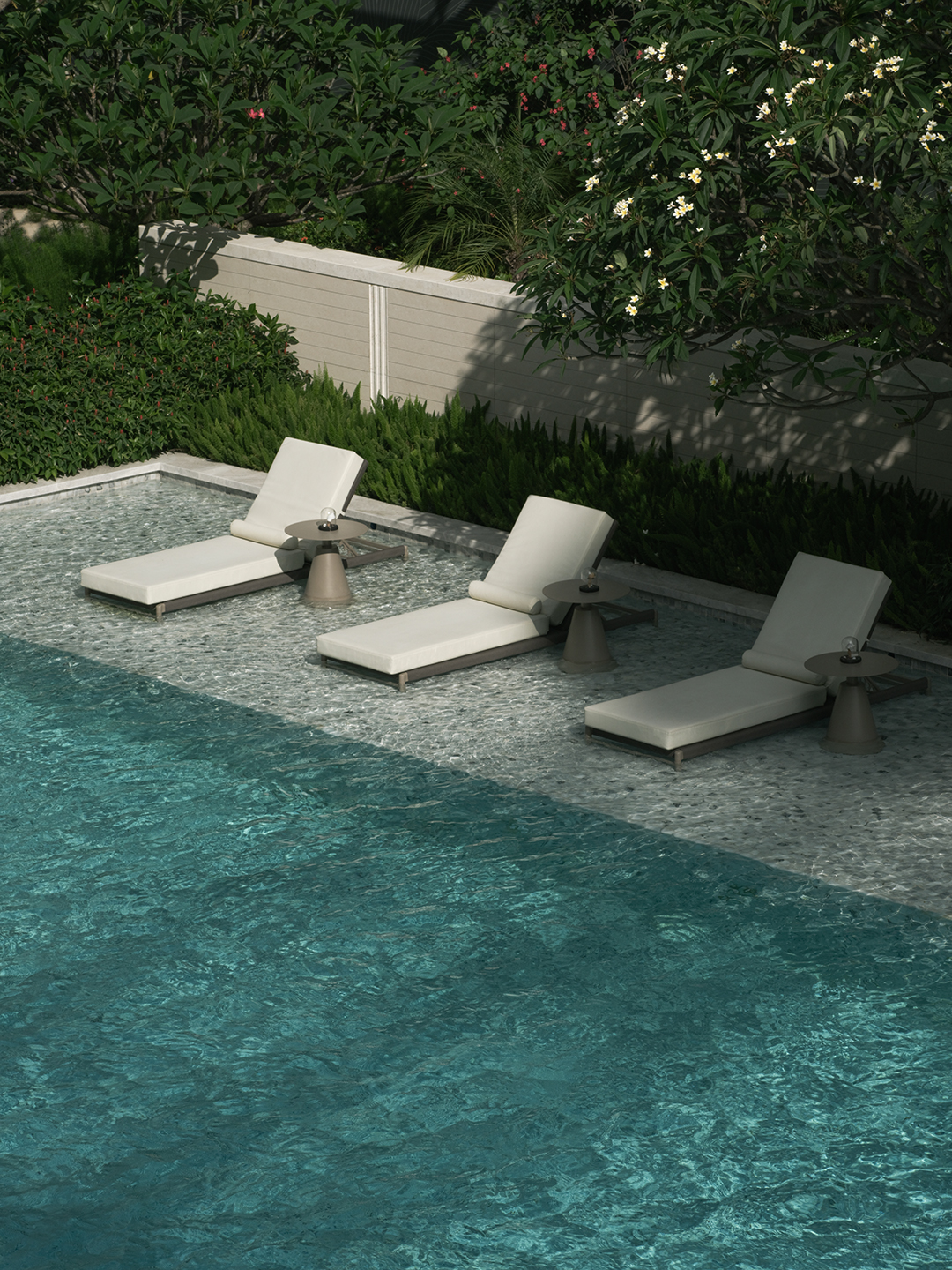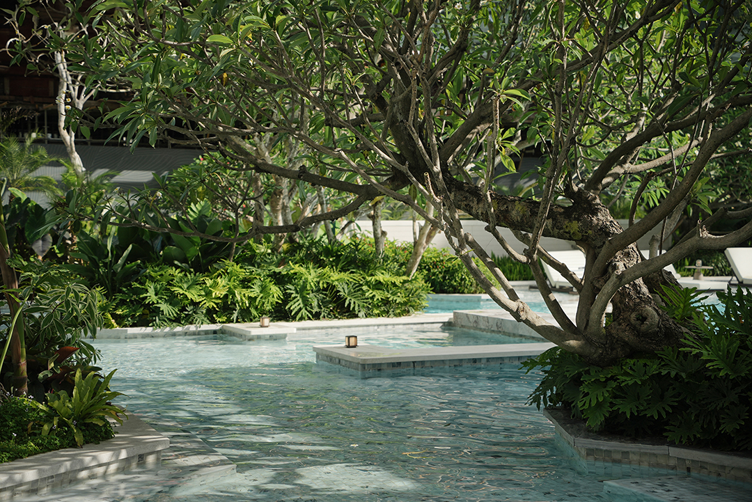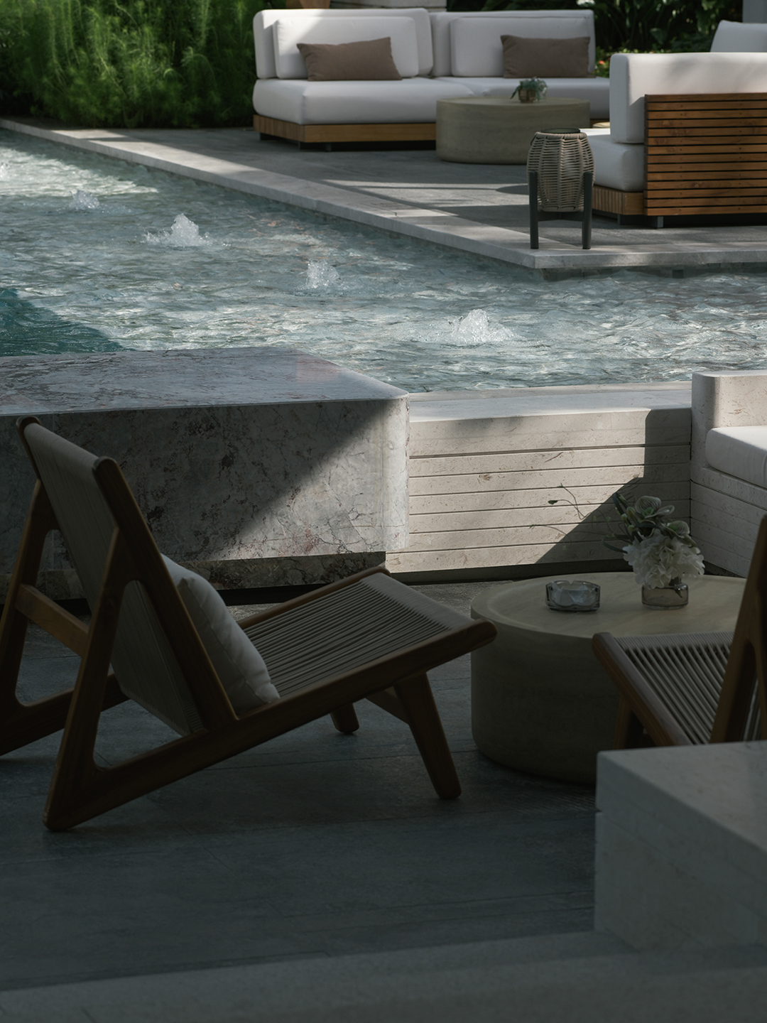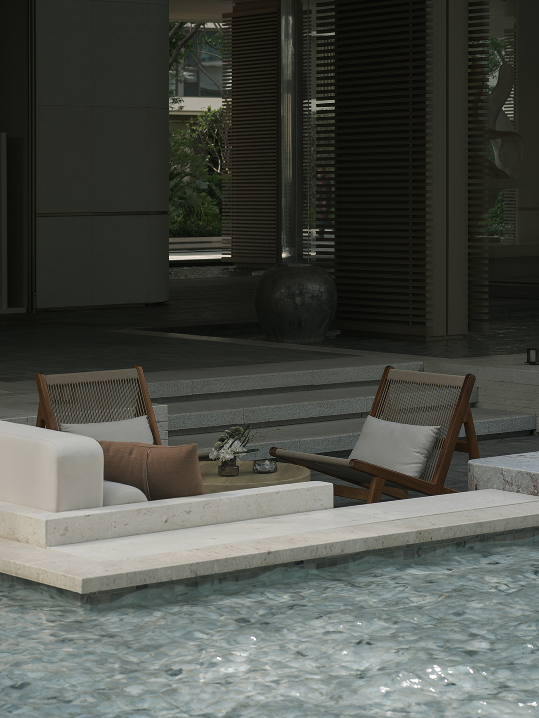 我们利用热带乔木、石材大板铺地与亲人尺度的座椅布局,营造既安静私密、又适合交流的社群场域。