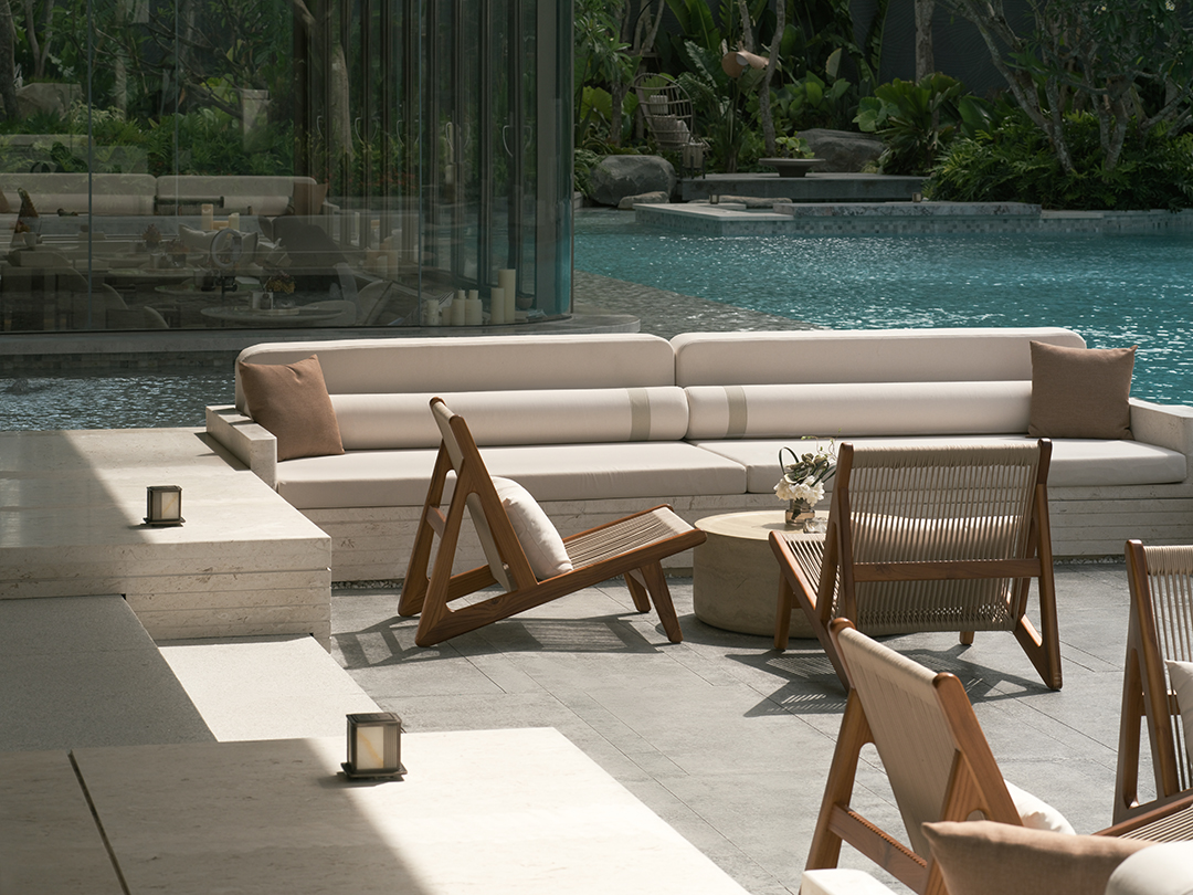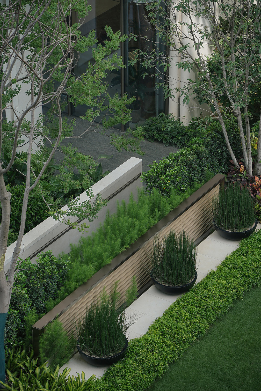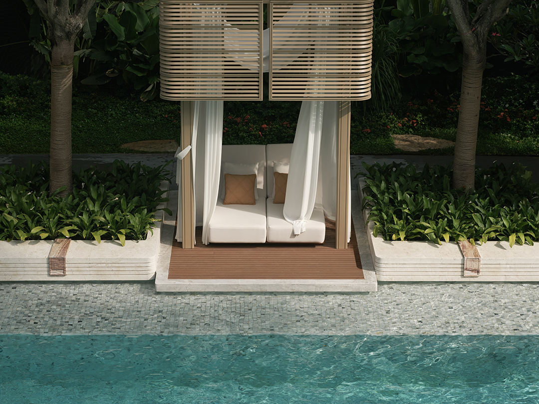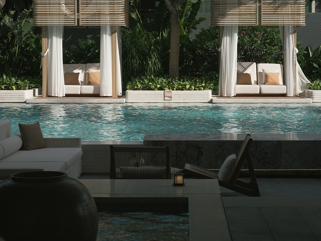 我们利用热带乔木、石材大板铺地与亲人尺度的座椅布局,营造既安静私密、又适合交流的社群场域。