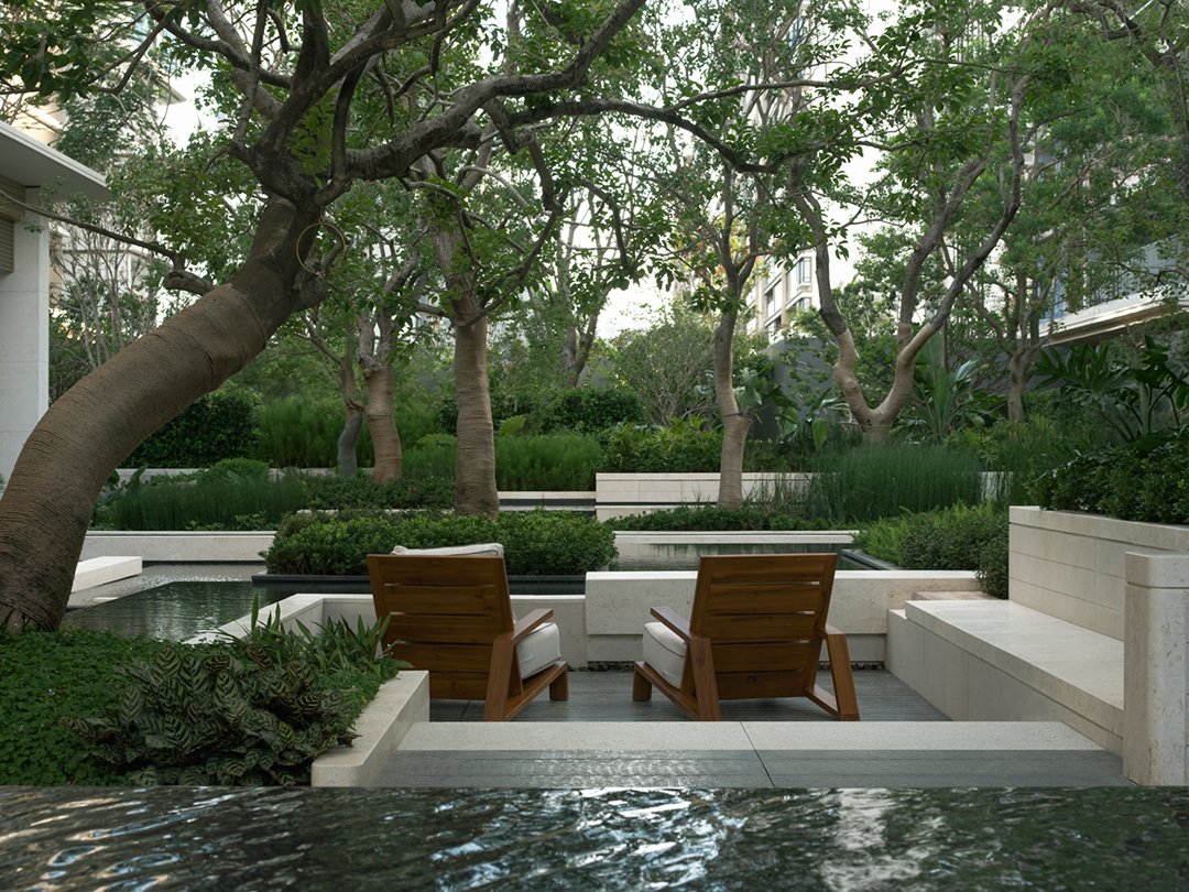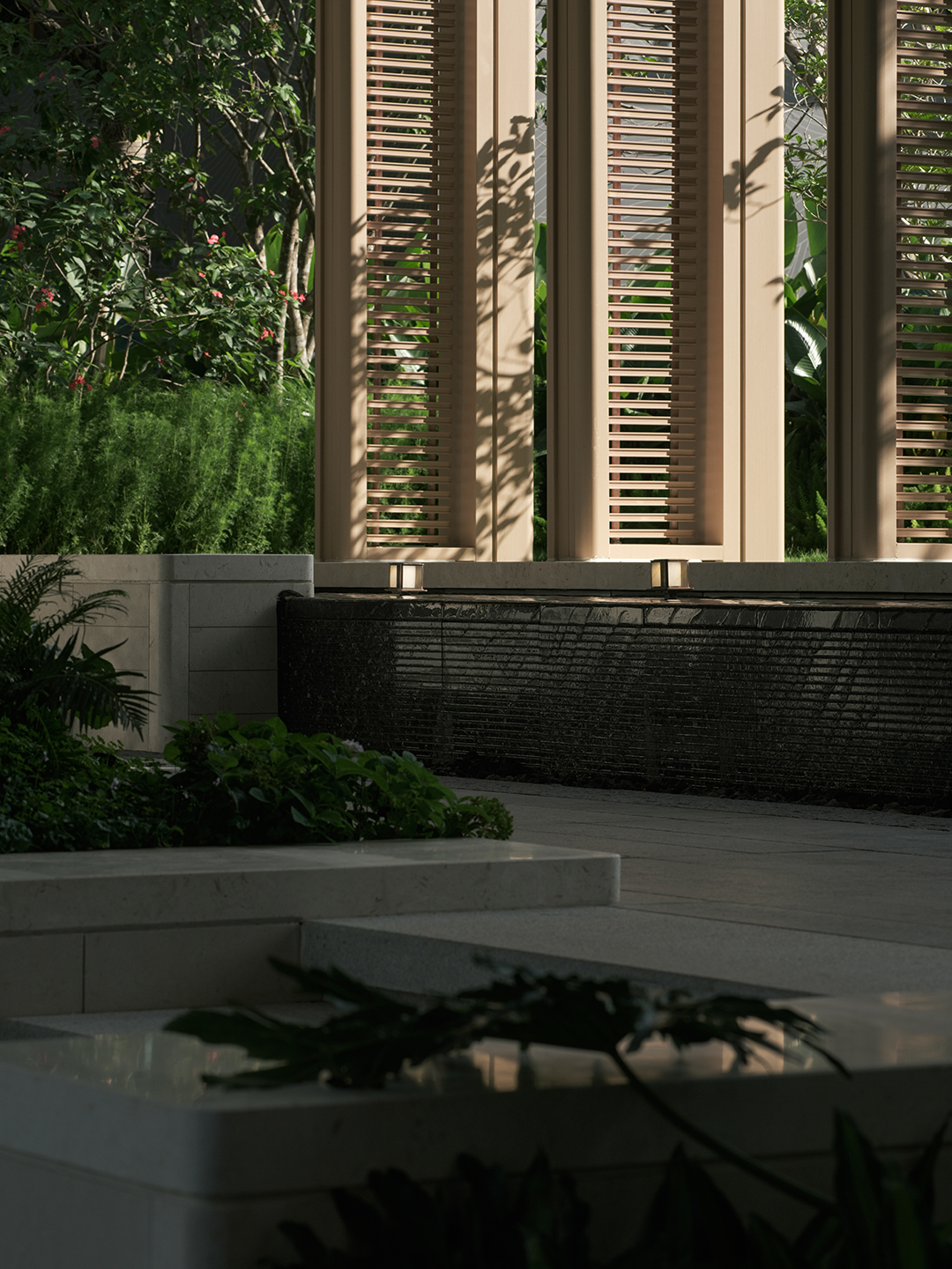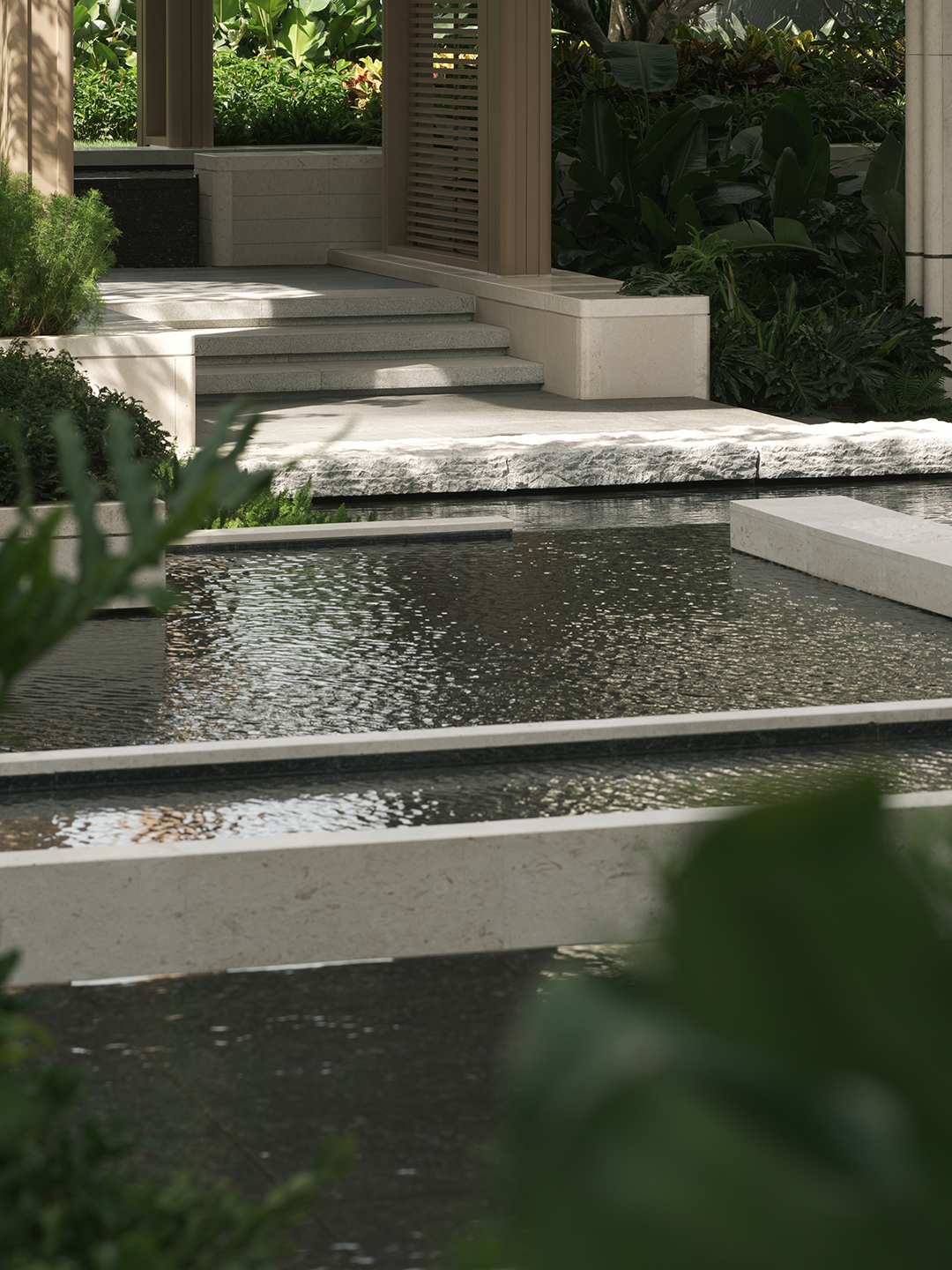 Beneath the forest canopy, “Sheltered by Trees” unfolds as a garden inspired by the tropical rainforest, revealing the raw elegance of nature-infused luxury. Meandering pathways invite leisurely exploration, crafting a tropical journey tailored for the community. The vivid colors and brightness of tropical flowers and fruits mark the changing seasons of a vibrant tropical lifestyle.