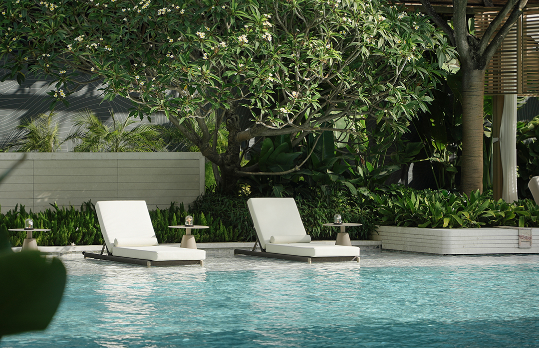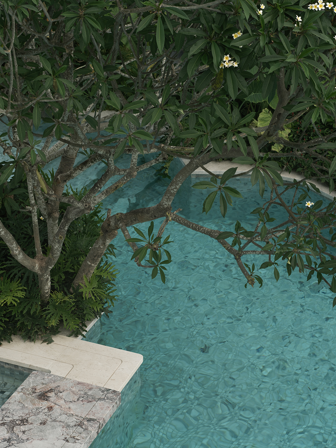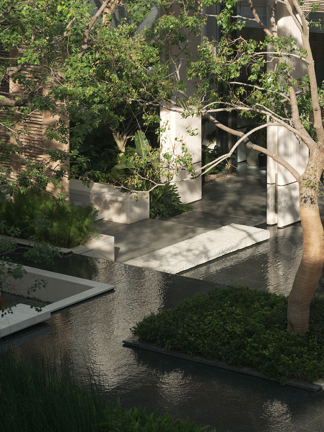 Beneath the forest canopy, “Sheltered by Trees” unfolds as a garden inspired by the tropical rainforest, revealing the raw elegance of nature-infused luxury. Meandering pathways invite leisurely exploration, crafting a tropical journey tailored for the community. The vivid colors and brightness of tropical flowers and fruits mark the changing seasons of a vibrant tropical lifestyle.