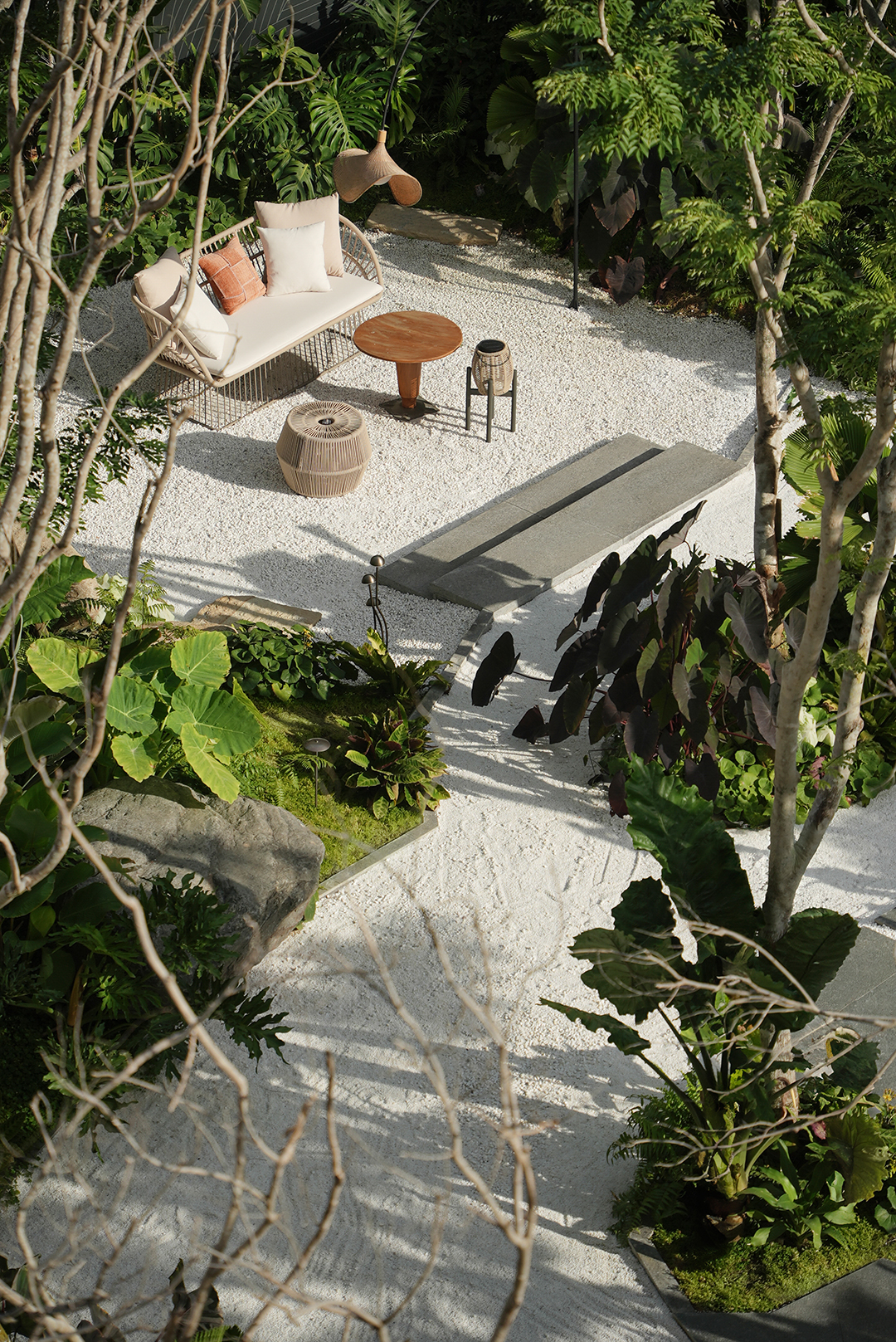 We use tropical trees, stone slabs and family-sized seats to create a community space that is both quiet and private, and suitable for communication.