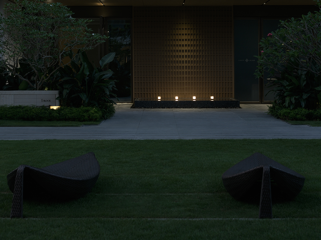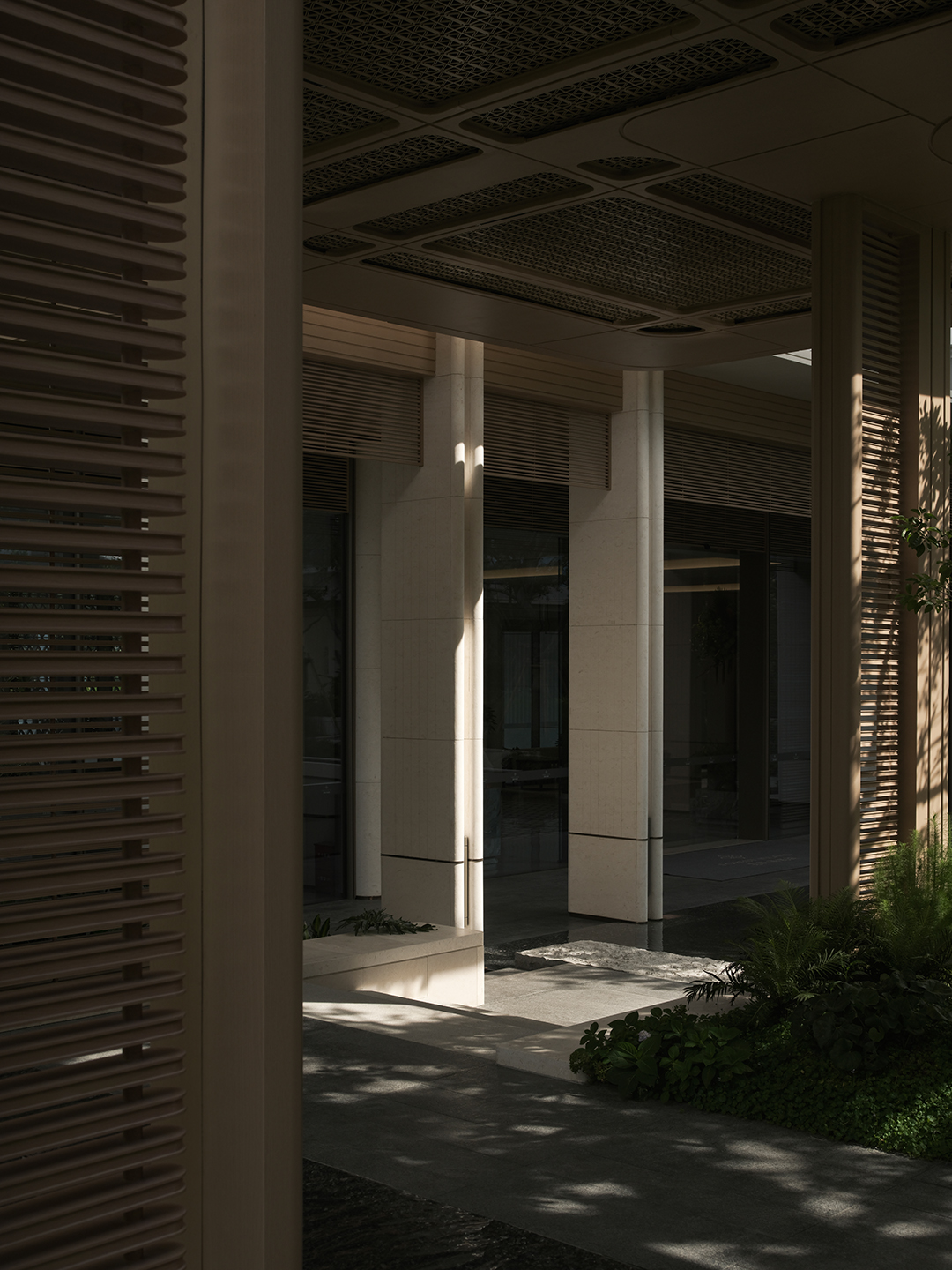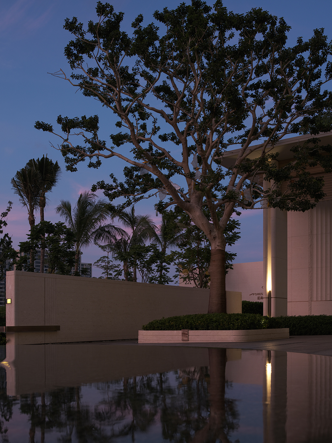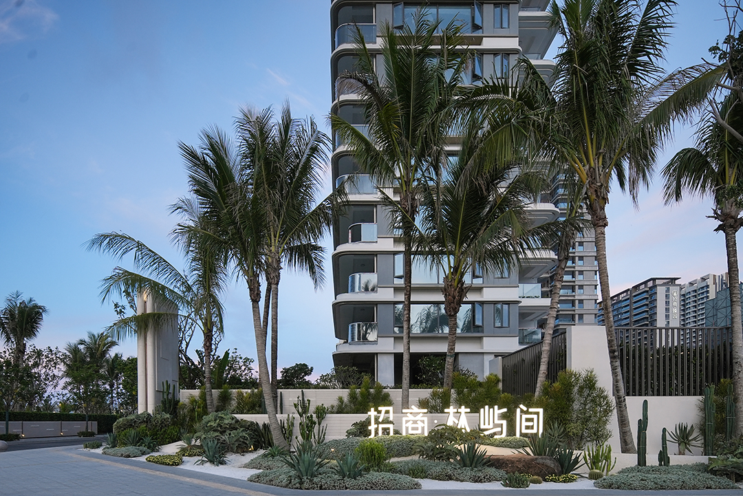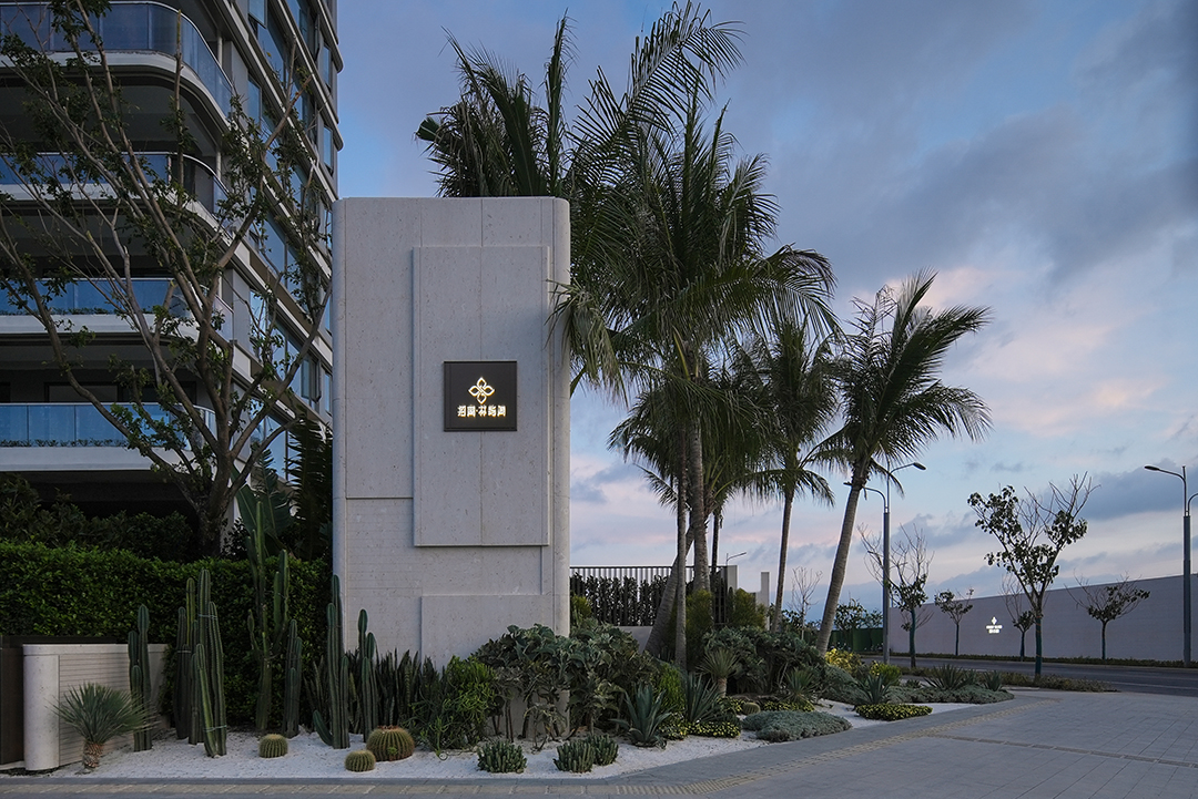 我们以高大的热带乔木、独特的沙生植物、海礁景观营造安静克制的前场空间,构建出柔和过渡的归家氛围。