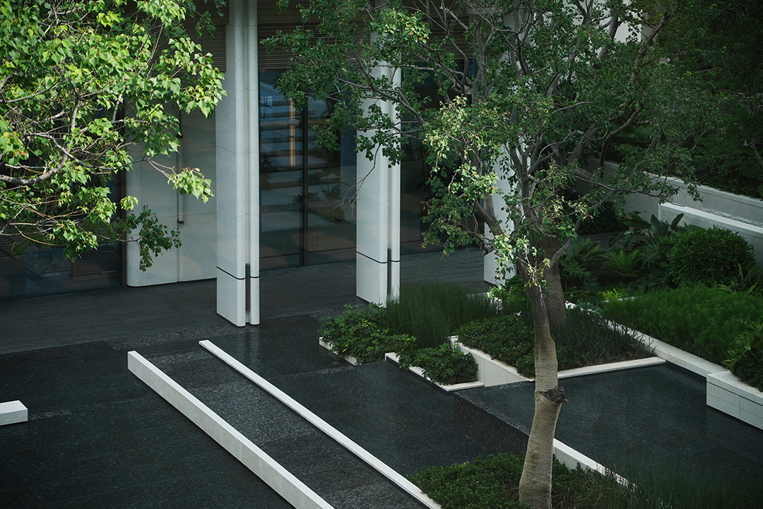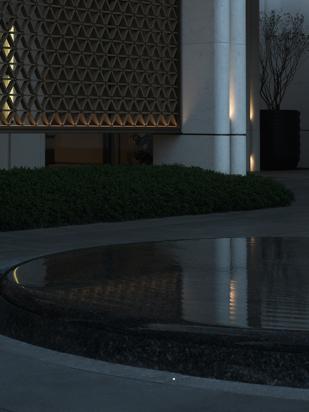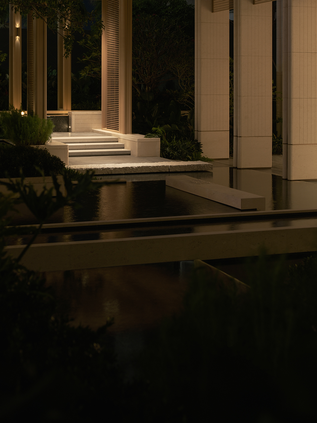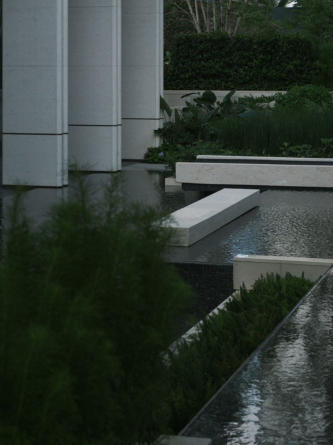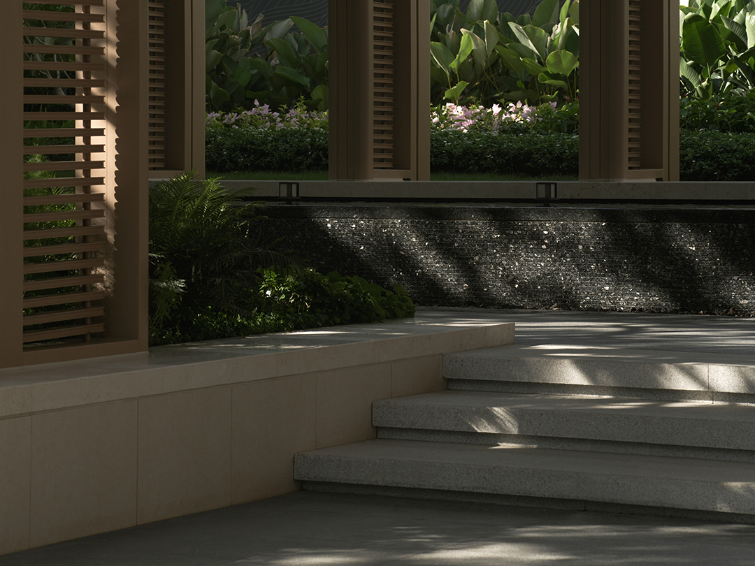 我们以高大的热带乔木、独特的沙生植物、海礁景观营造安静克制的前场空间,构建出柔和过渡的归家氛围。