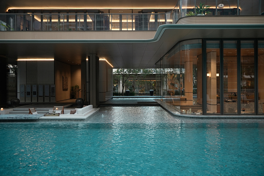 度假的氛围,往往在抵达的那一刻就已经产生。社区前场的“降噪设计”,演绎城市之中的静谧场域,设计注重“归家的仪式感”与“城市到度假的心理转场”。