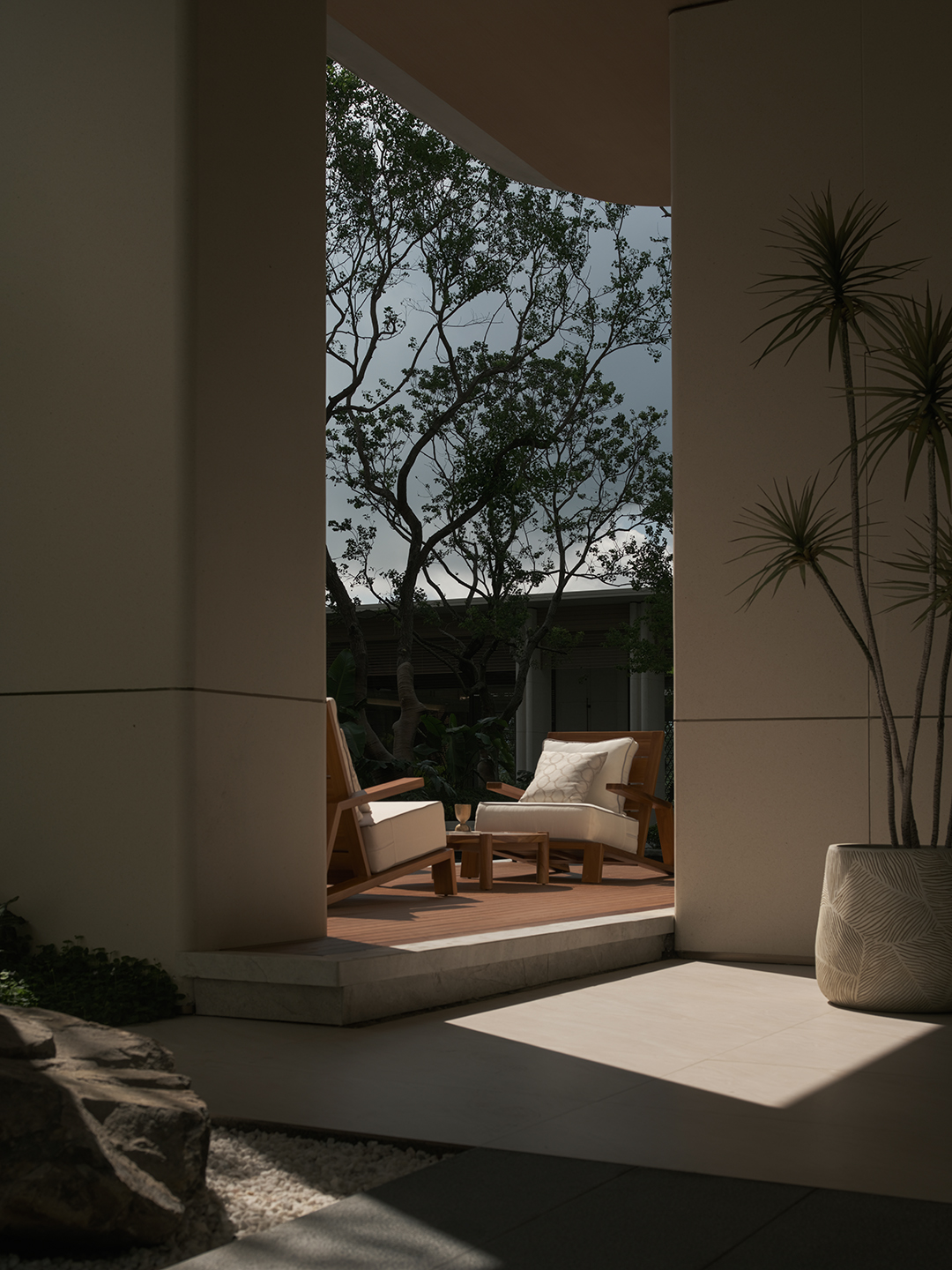 在光与影的界面交替中,空间回归自然本质,城市与度假在此交融。归家不再是日常的重复,而是开启另一种生活方式的前奏。