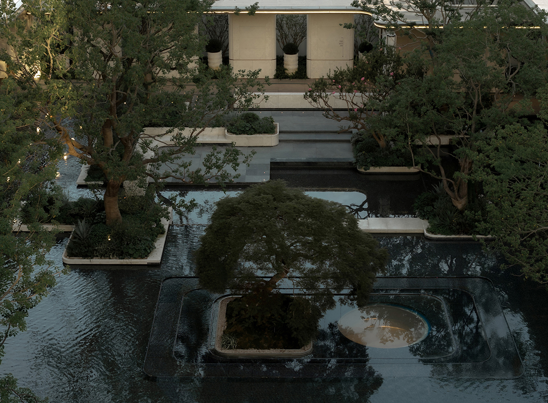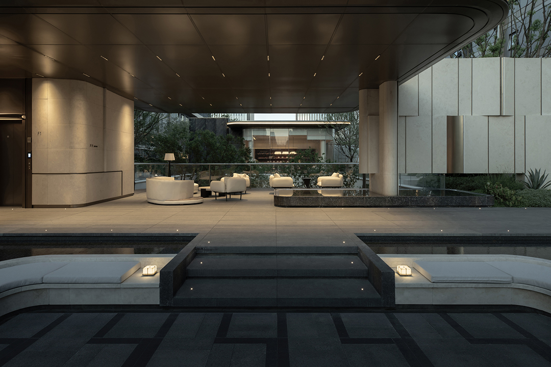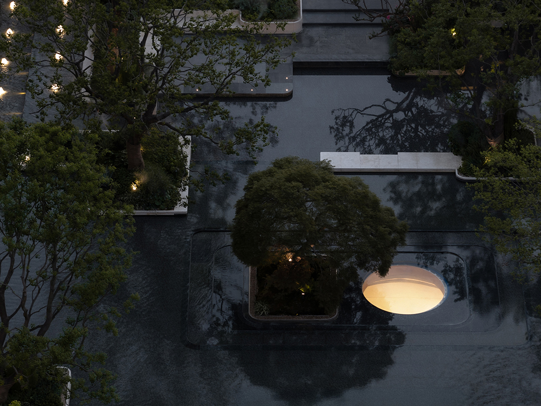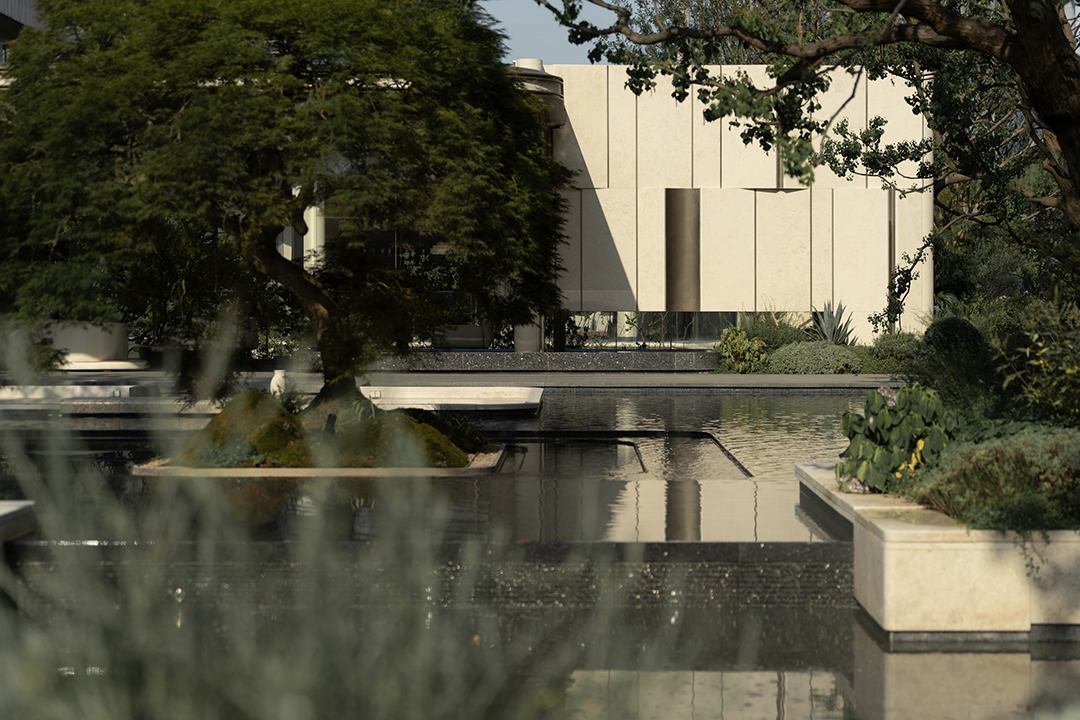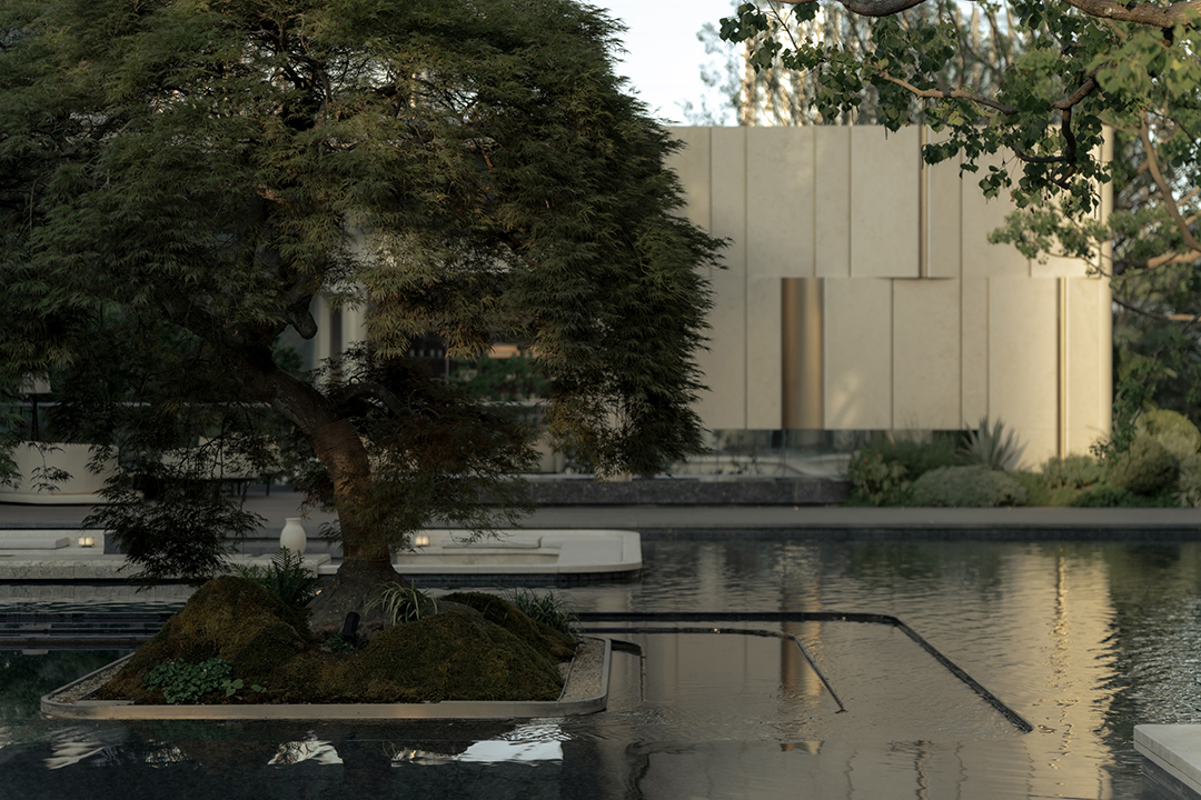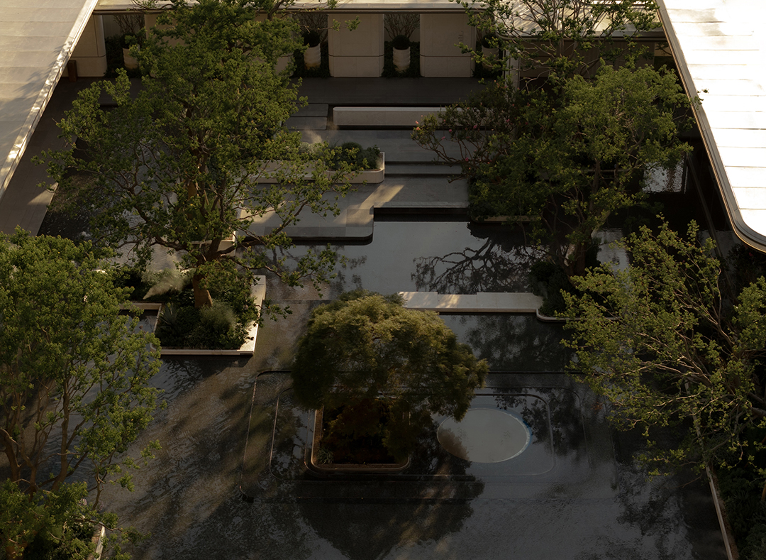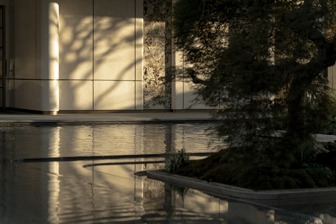 The Venato stone, the texture of bronze-colored aluminum panels, and the nearly 200-year-old famous Japanese maple with spreading branches form a visual echo, bringing endless shade to those who stay here.