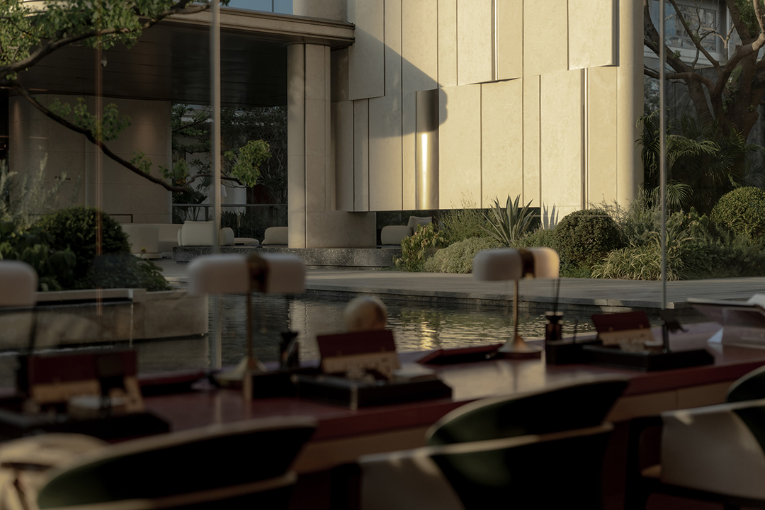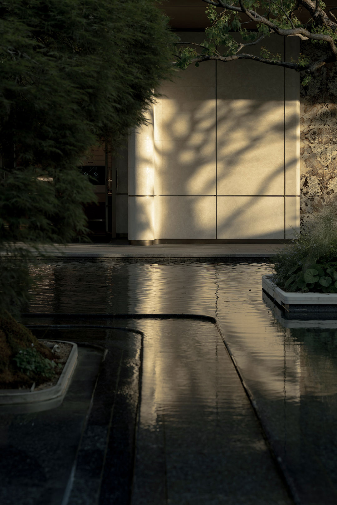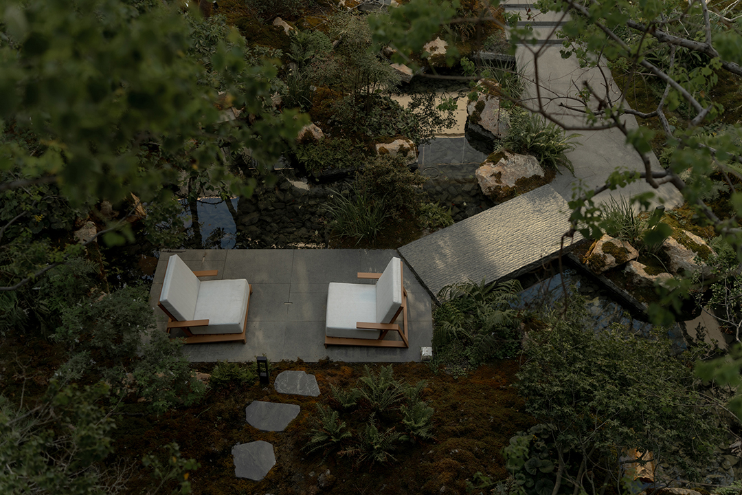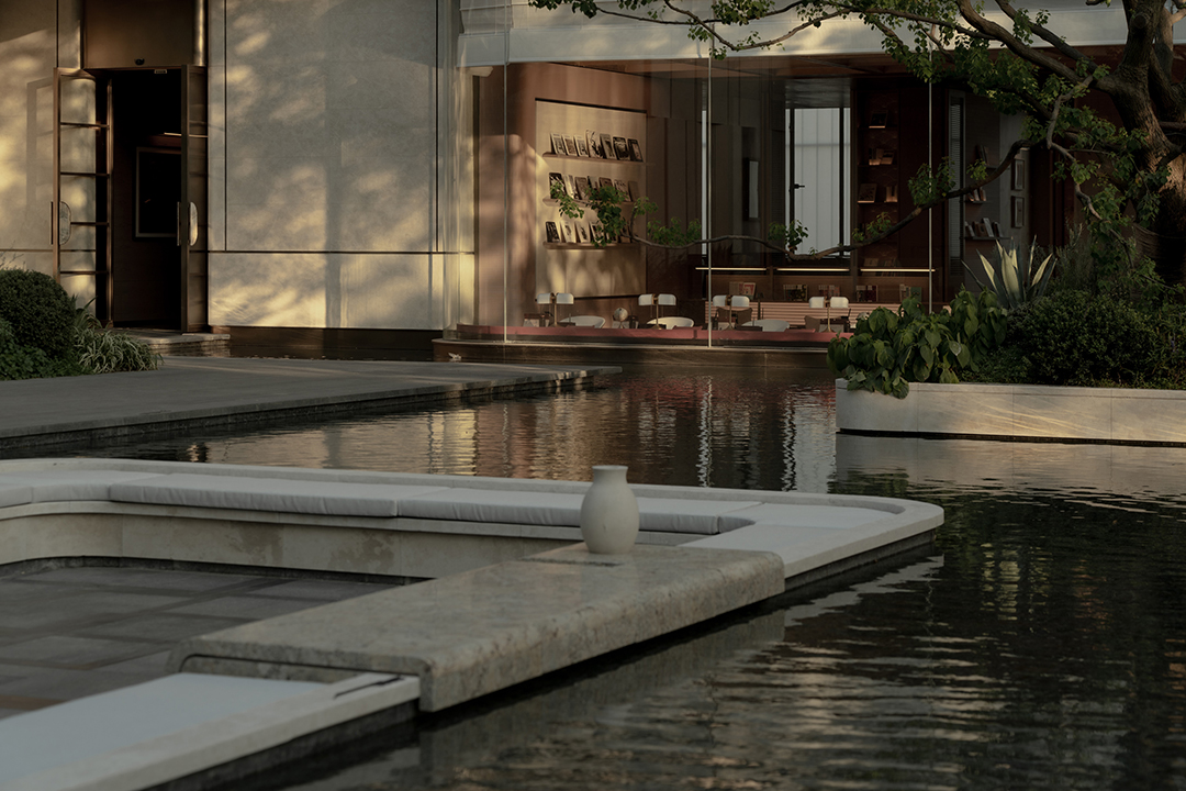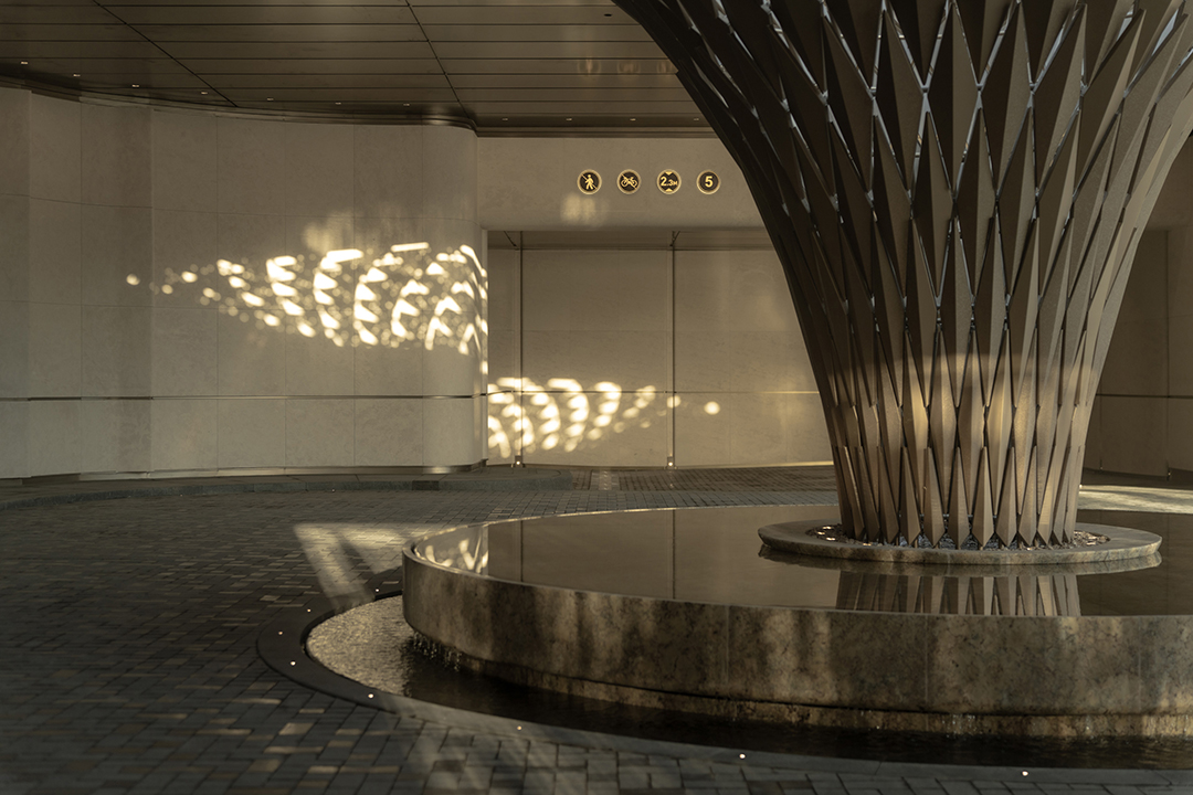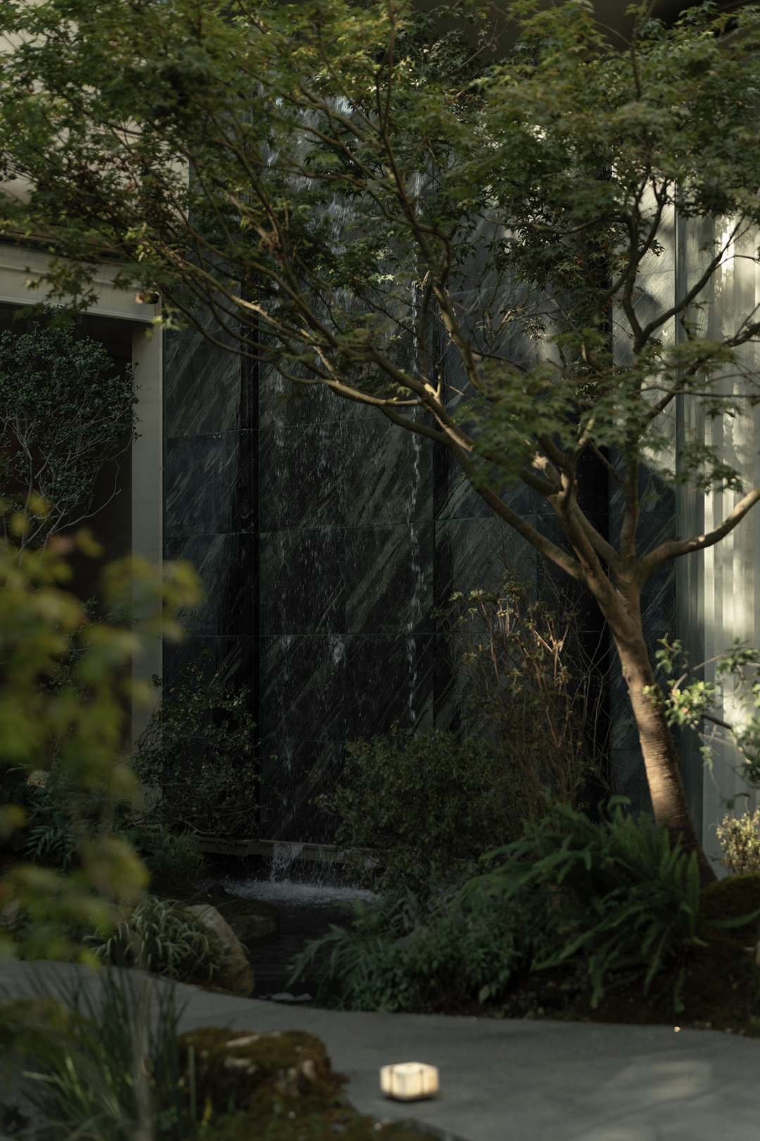 The Venato stone, the texture of bronze-colored aluminum panels, and the nearly 200-year-old famous Japanese maple with spreading branches form a visual echo, bringing endless shade to those who stay here.