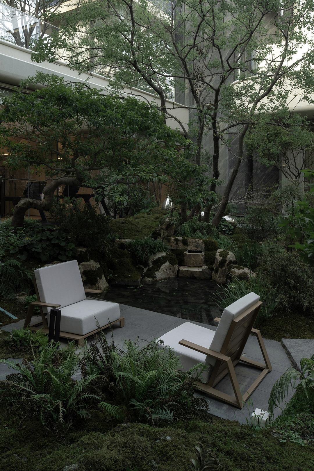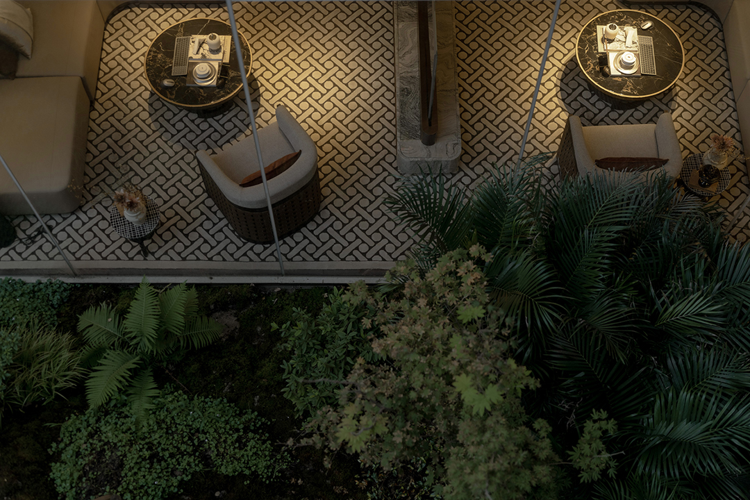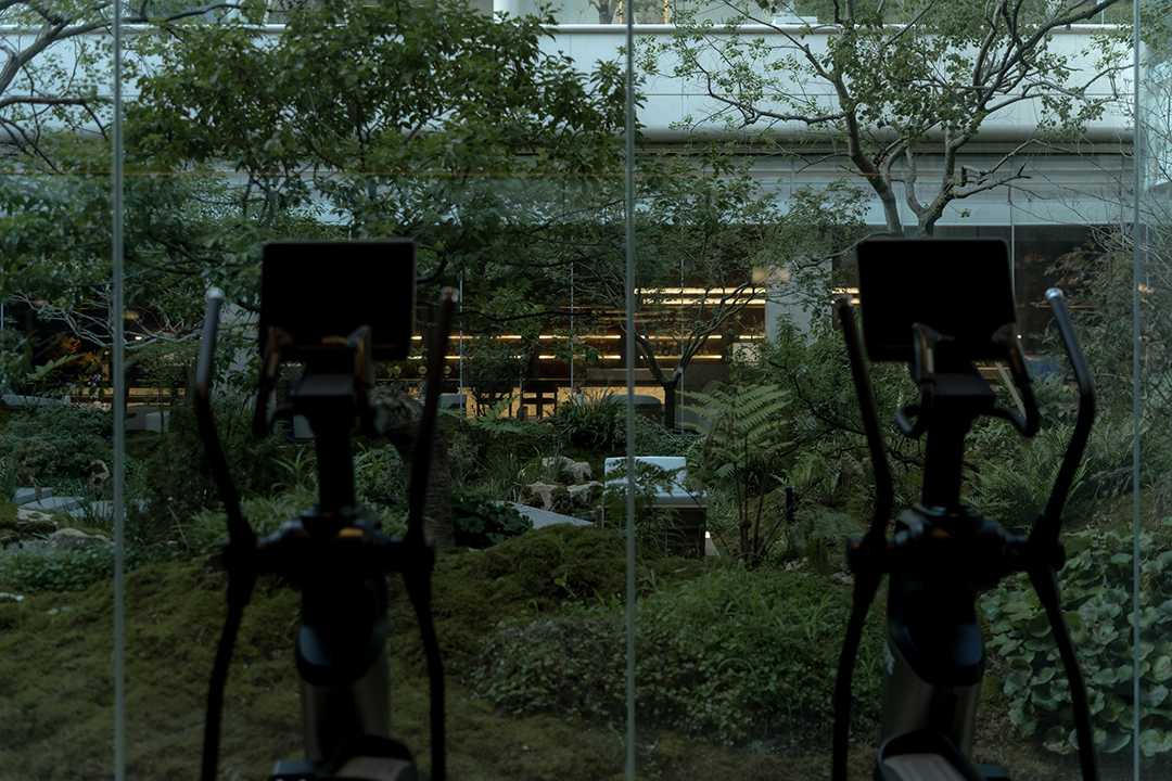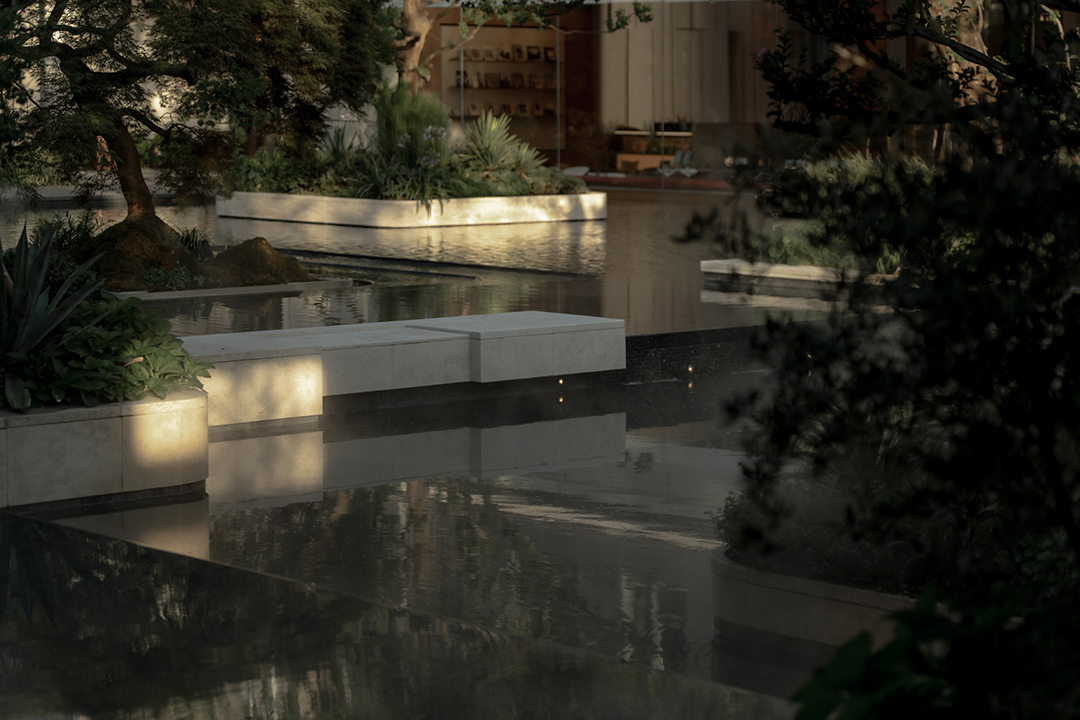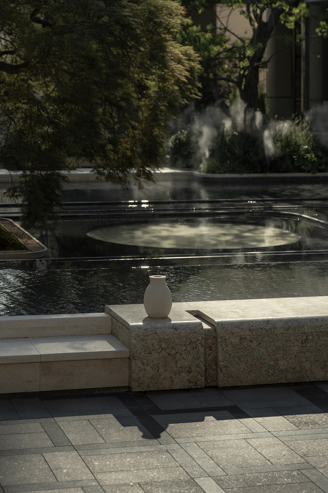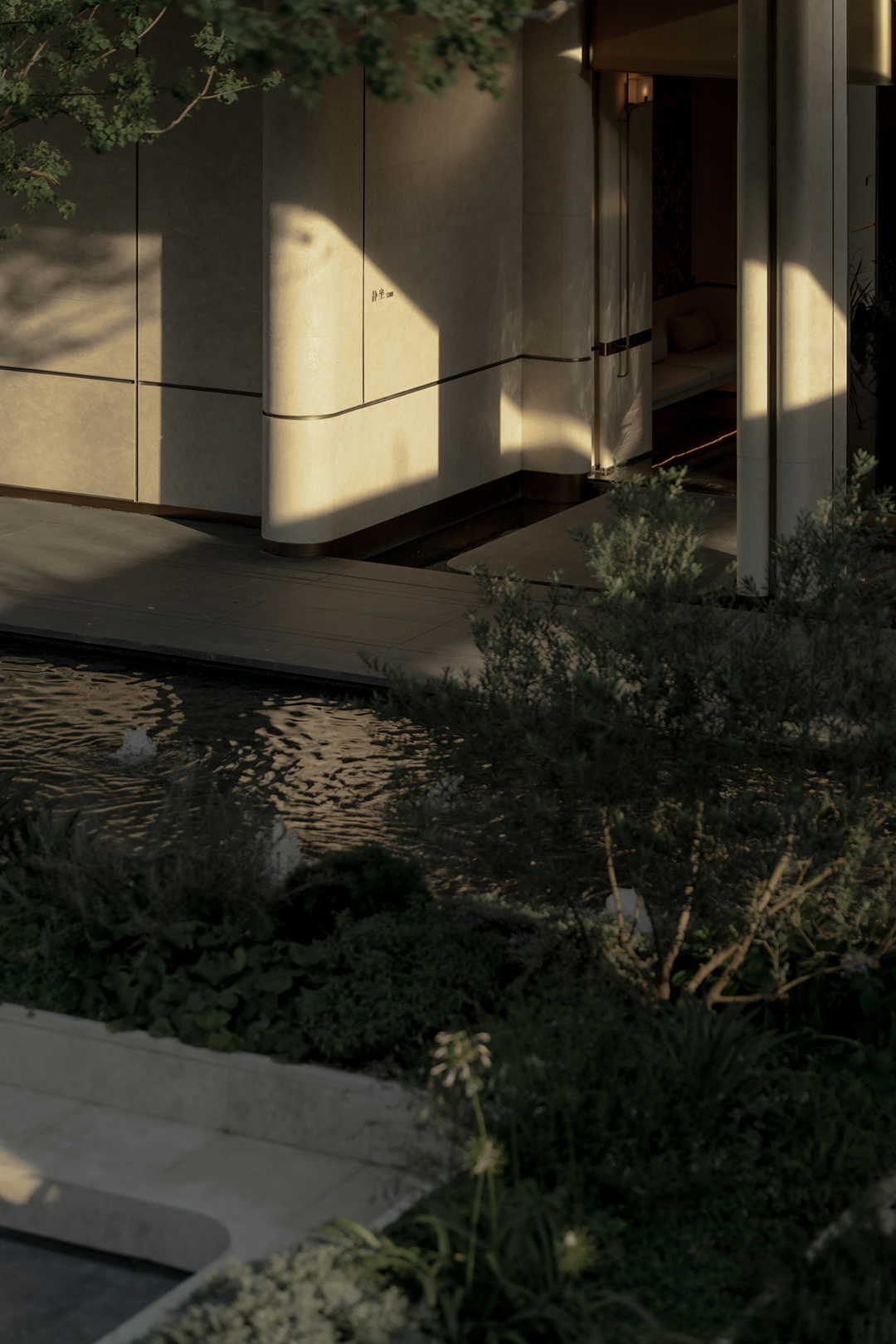 The Venato stone, the texture of bronze-colored aluminum panels, and the nearly 200-year-old famous Japanese maple with spreading branches form a visual echo, bringing endless shade to those who stay here.