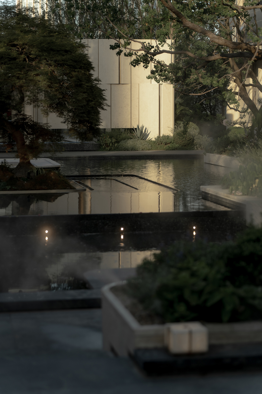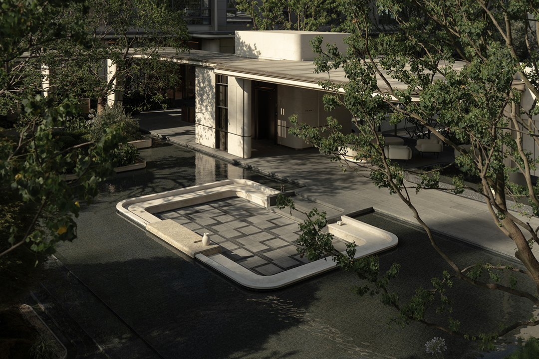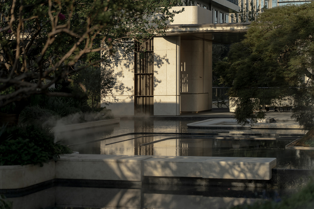 景观汲取苏州园林的精巧的造园特点,在近人尺度上兼顾美学安全与匠心工艺,将自然的斑驳与设计的精致巧妙结合,在咫尺方庭之间营造梦境般的山水意境。
