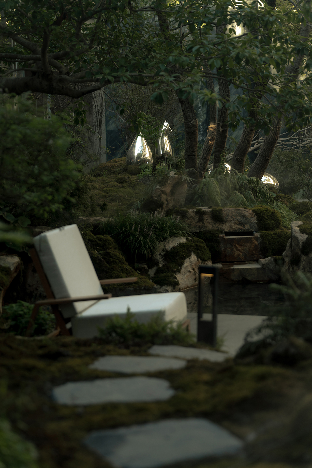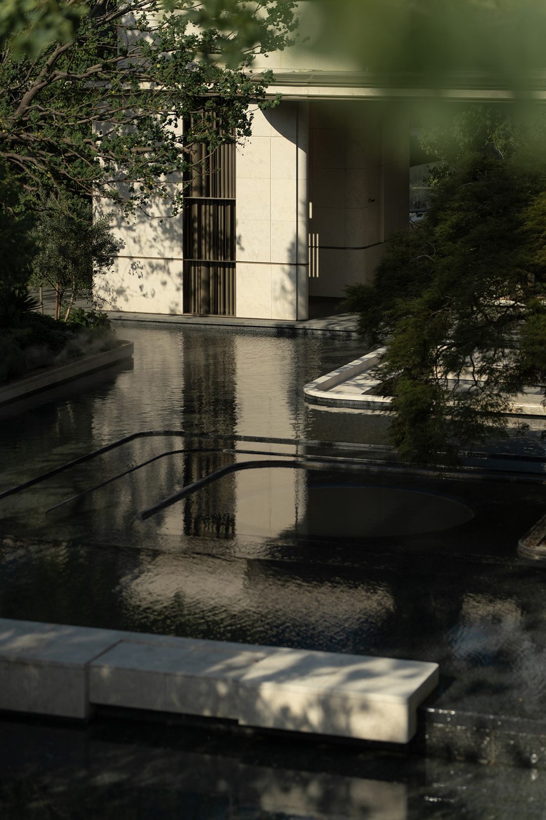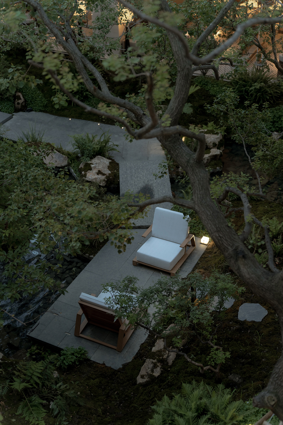 景观汲取苏州园林的精巧的造园特点,在近人尺度上兼顾美学安全与匠心工艺,将自然的斑驳与设计的精致巧妙结合,在咫尺方庭之间营造梦境般的山水意境。