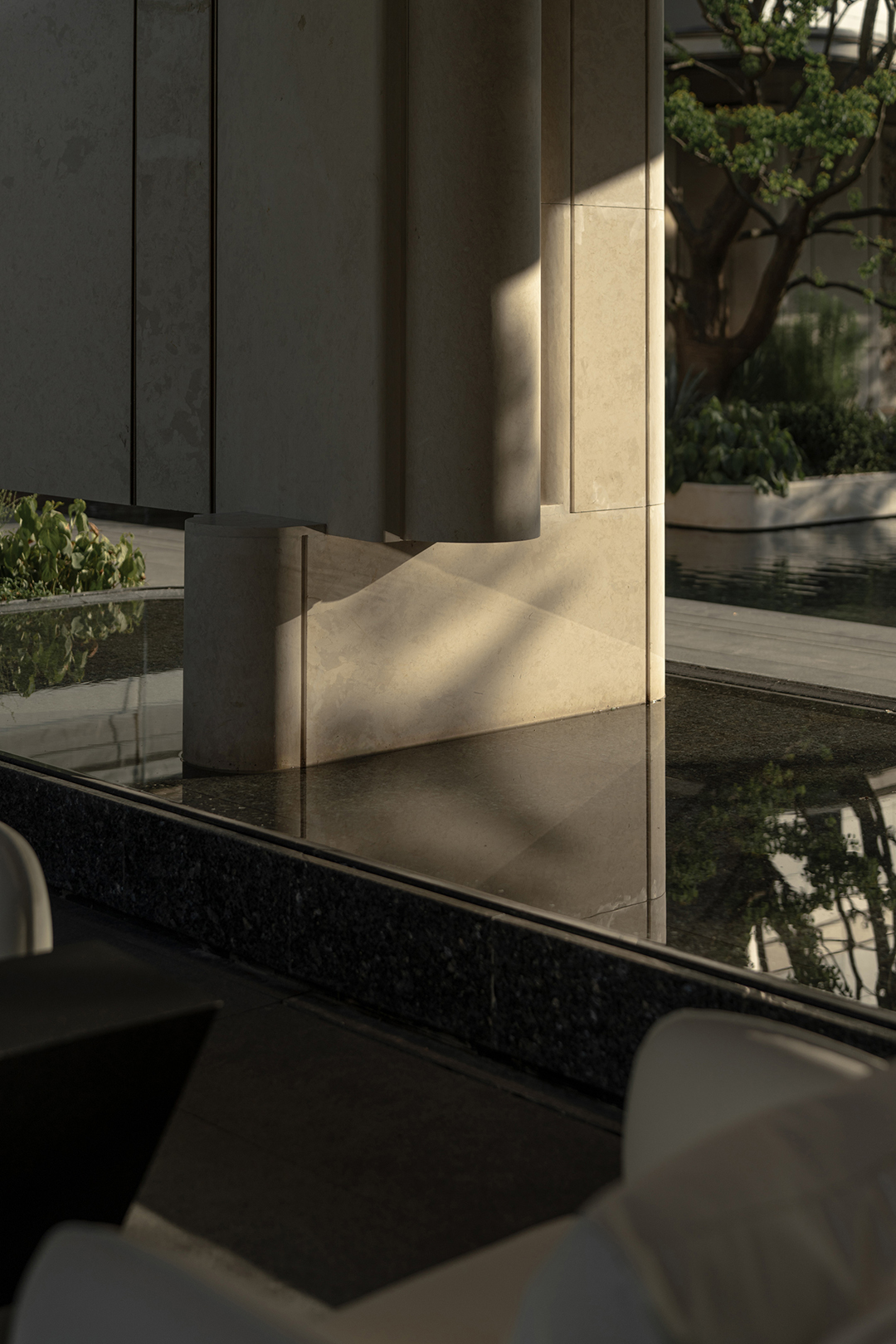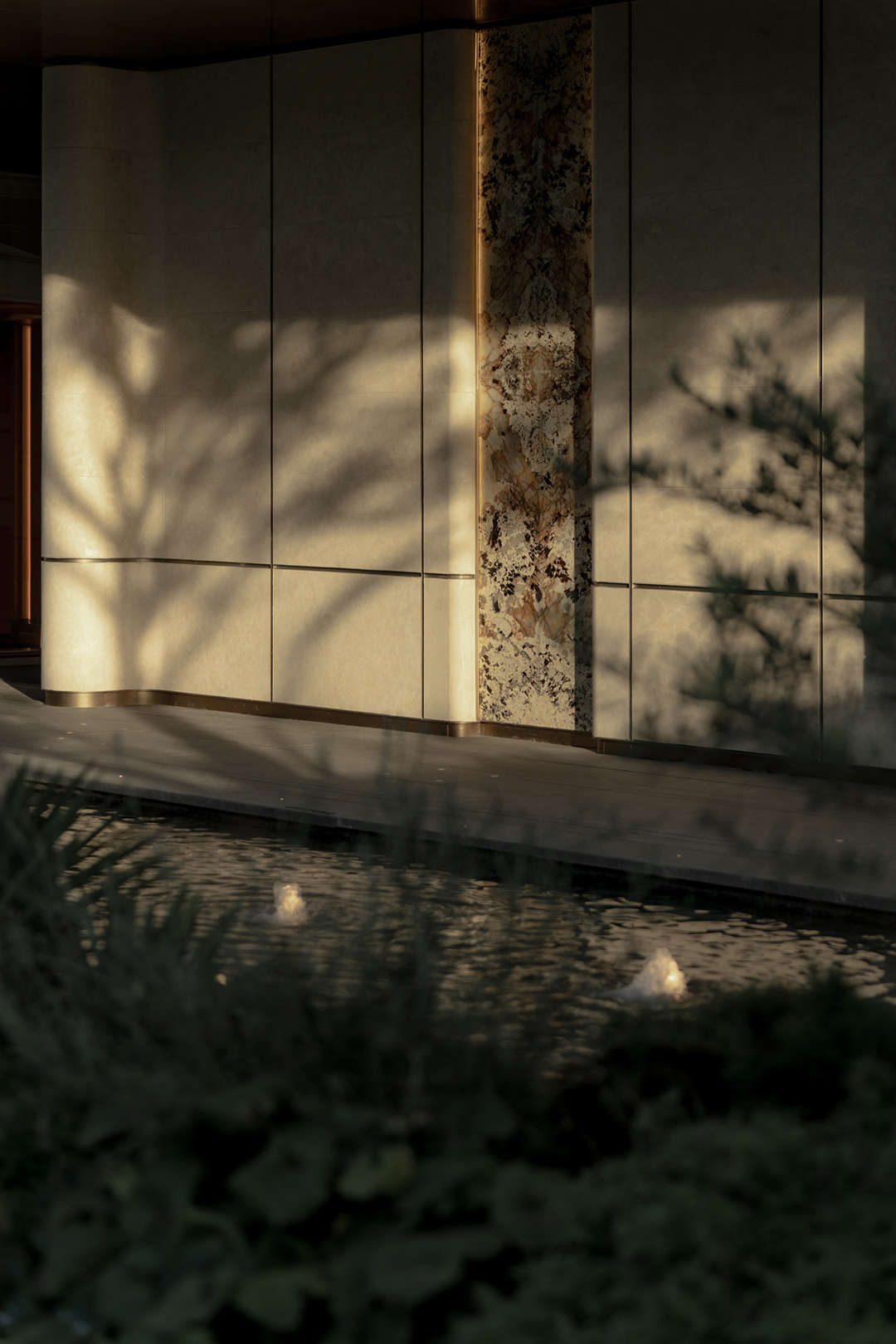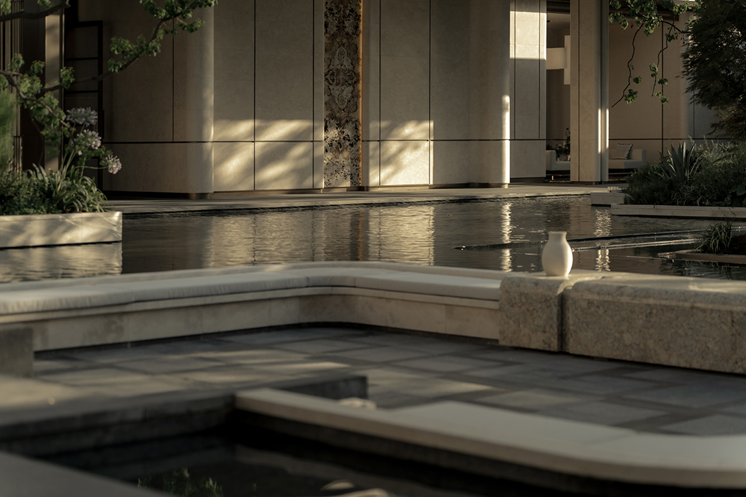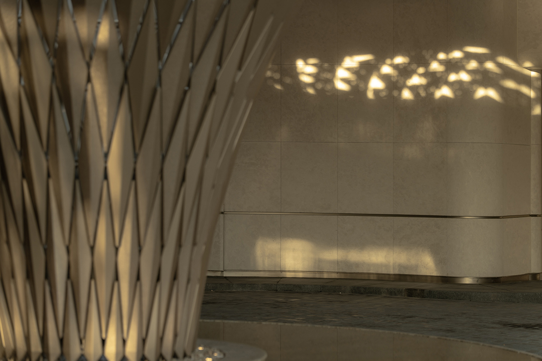 The wall details, with curled edges and recessed joints, along with the bowl-shaped curved water feature, all showcase meticulous craftsmanship. The uniformly coordinated beige tone, paired with the selection of Venato marble—an exquisite stone—exudes a unique style without losing a sense of ceremonial solemnity. Through restrained and elegant forms, it interprets an atmosphere of refined living and enhances the exclusive, custom-made feel worthy of a luxury residence.