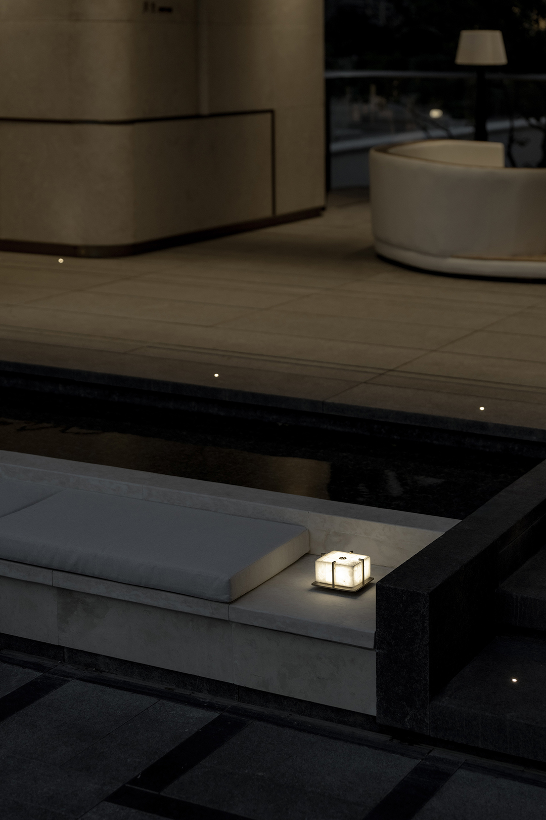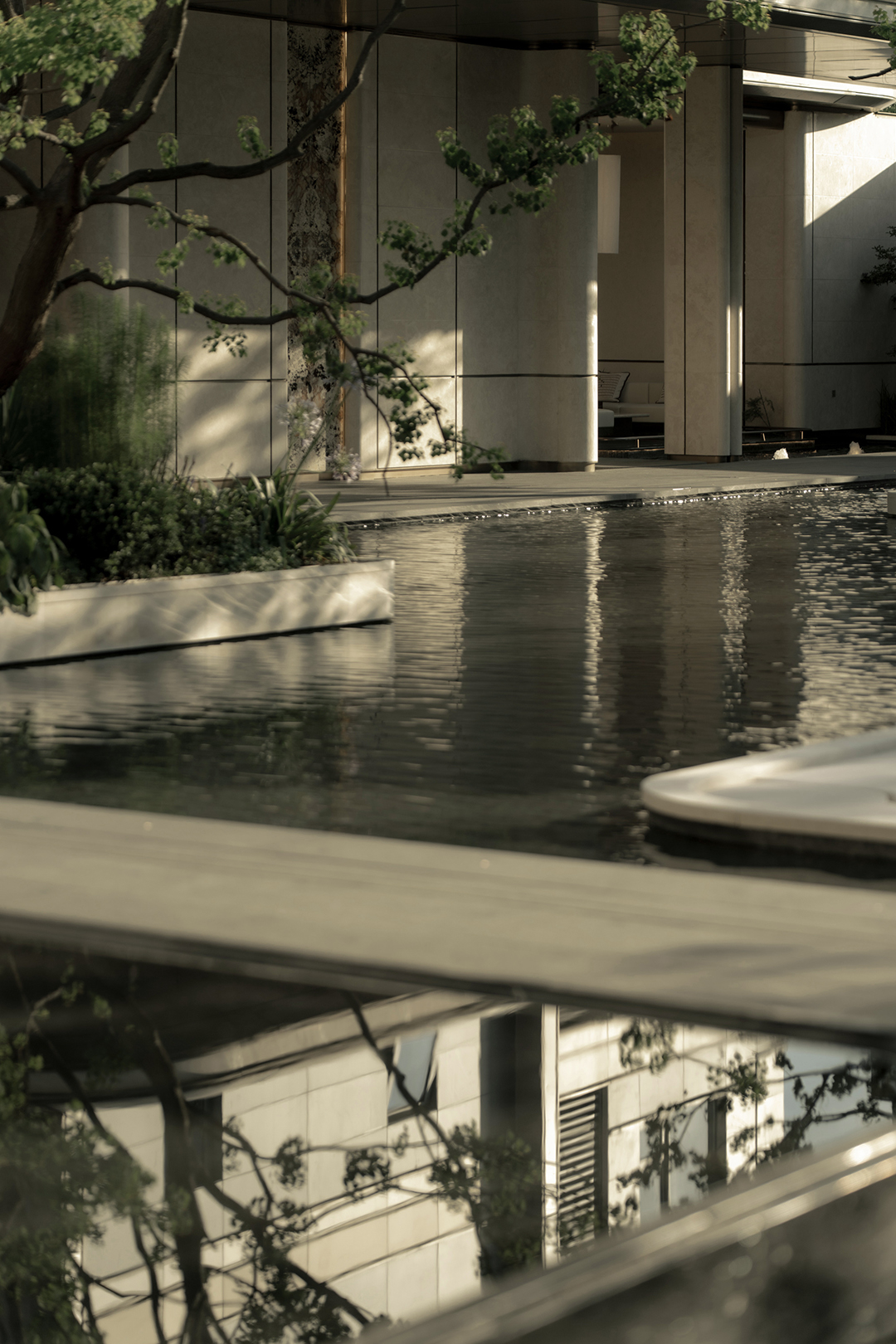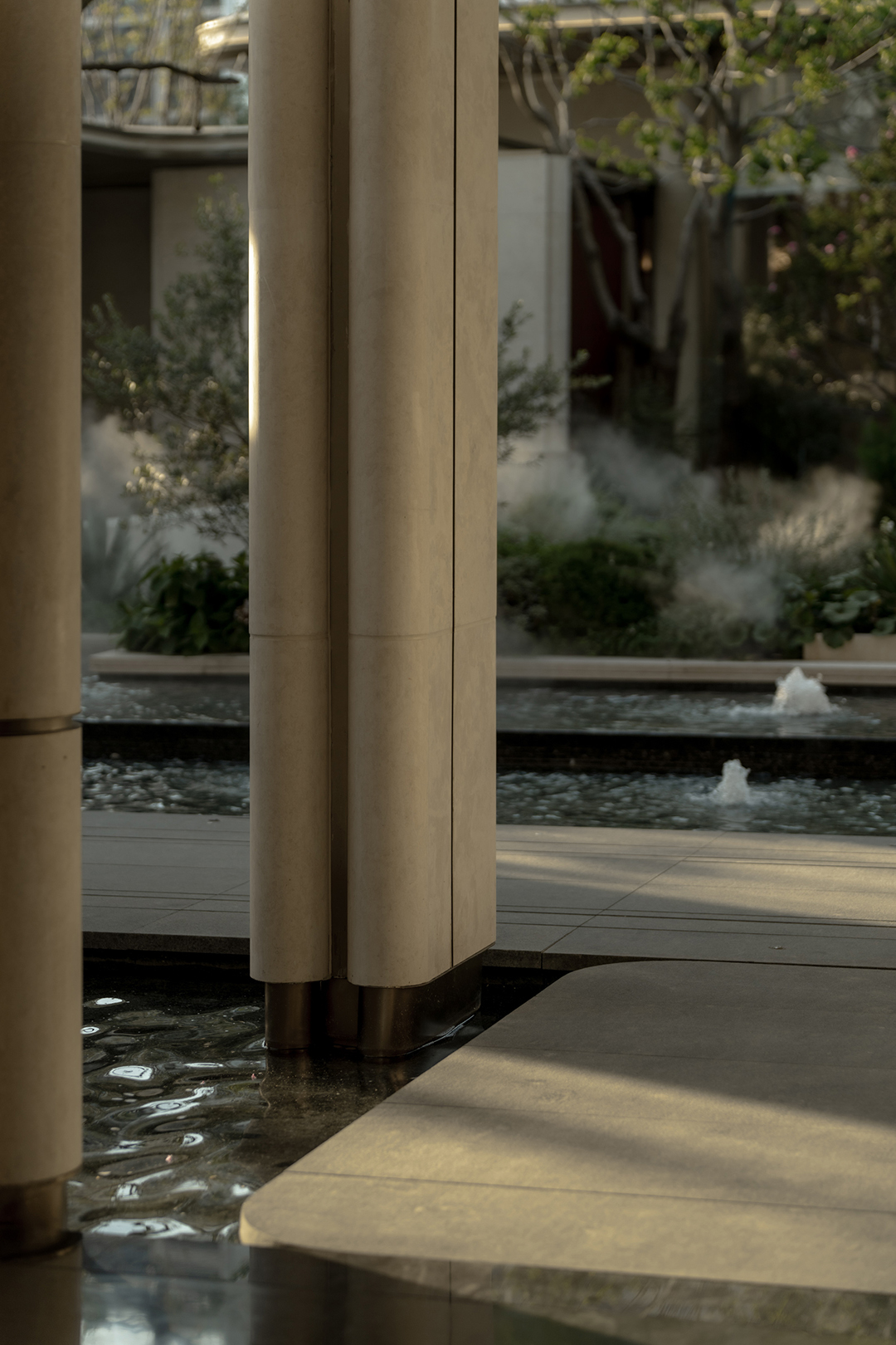The wall details, with curled edges and recessed joints, along with the bowl-shaped curved water feature, all showcase meticulous craftsmanship. The uniformly coordinated beige tone, paired with the selection of Venato marble—an exquisite stone—exudes a unique style without losing a sense of ceremonial solemnity. Through restrained and elegant forms, it interprets an atmosphere of refined living and enhances the exclusive, custom-made feel worthy of a luxury residence.
