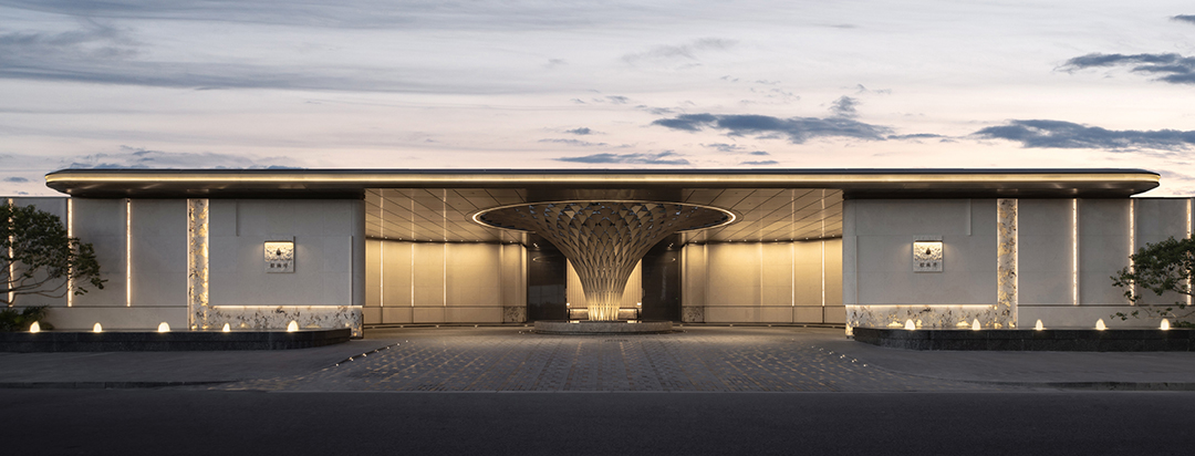 来到入口落客院,首先感受到的是约250米长的超长景观墙界面,以及42m宽、4.8m高的仪式感门厅。
