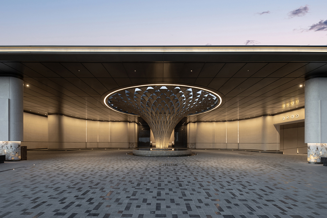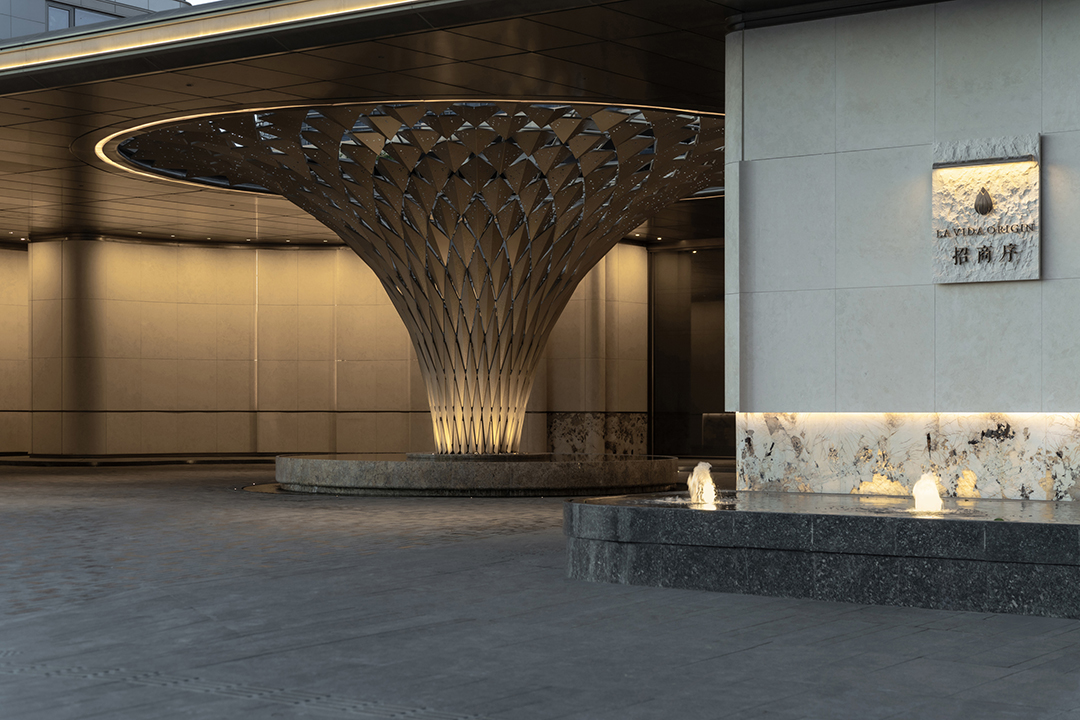 The entrance features a hotel-style roundabout drop-off area, with an art installation symbolizing "the four great gatherings under heaven" set at its center. This not only presents a noble and ceremonial facade for returning home but also echoes the golden pool base crafted with Suzhou fan craftsmanship.