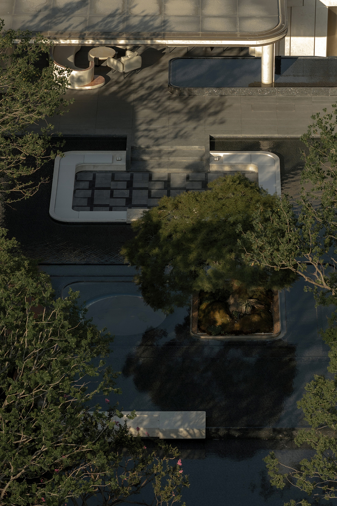 维纳多石材、古铜色的铝板肌理与枝桠舒展近200年名木羽毛枫形成视觉呼应,为驻留其中的人,带来无尽的浓荫环绕。