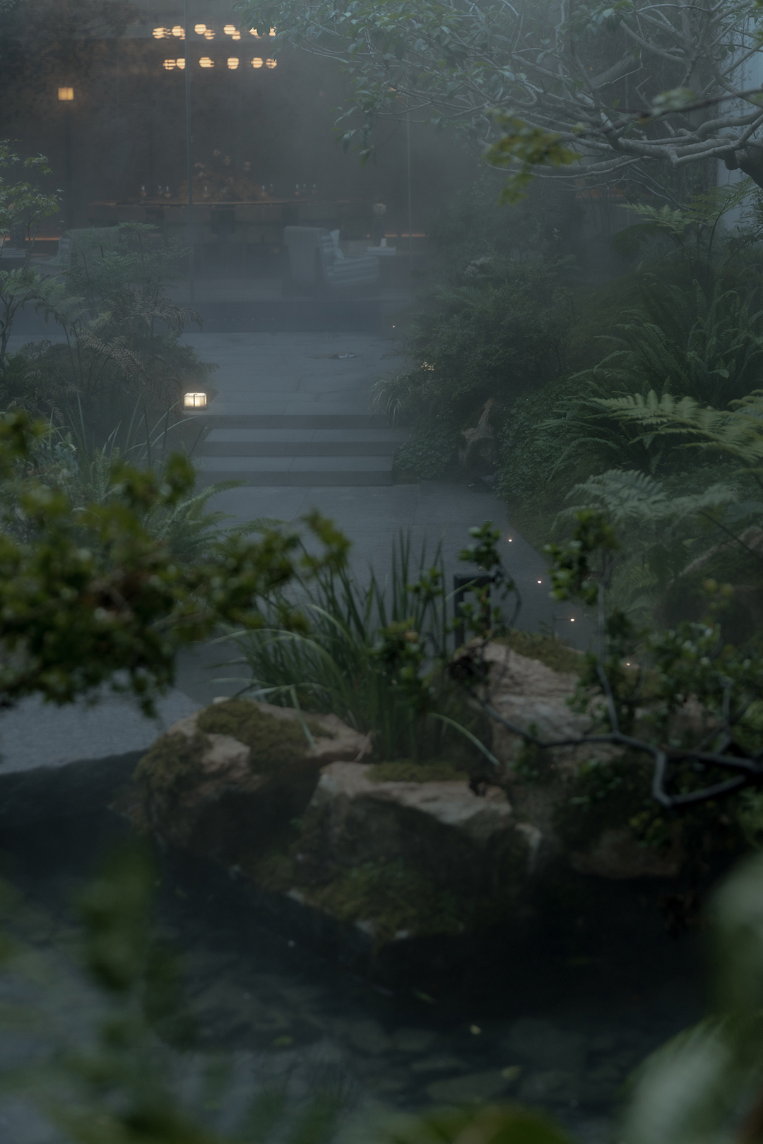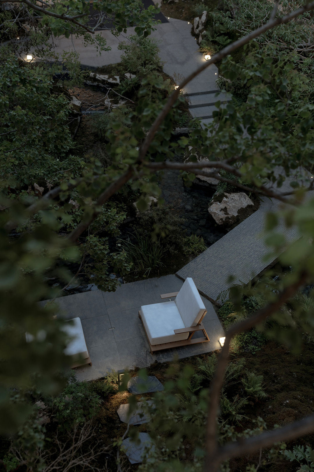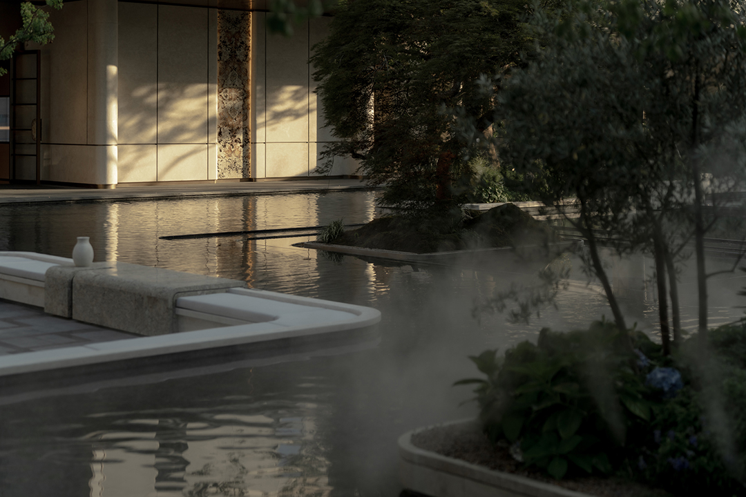 在立体高差的视野联动下,水上雾森、休闲平台、约6M高的飞瀑水幕、溪流潺潺、鱼群悠游,结合自然垒石工艺与高差叠级溯溪体验,从视觉、听觉、触觉到嗅觉,多维感官被充分调动。